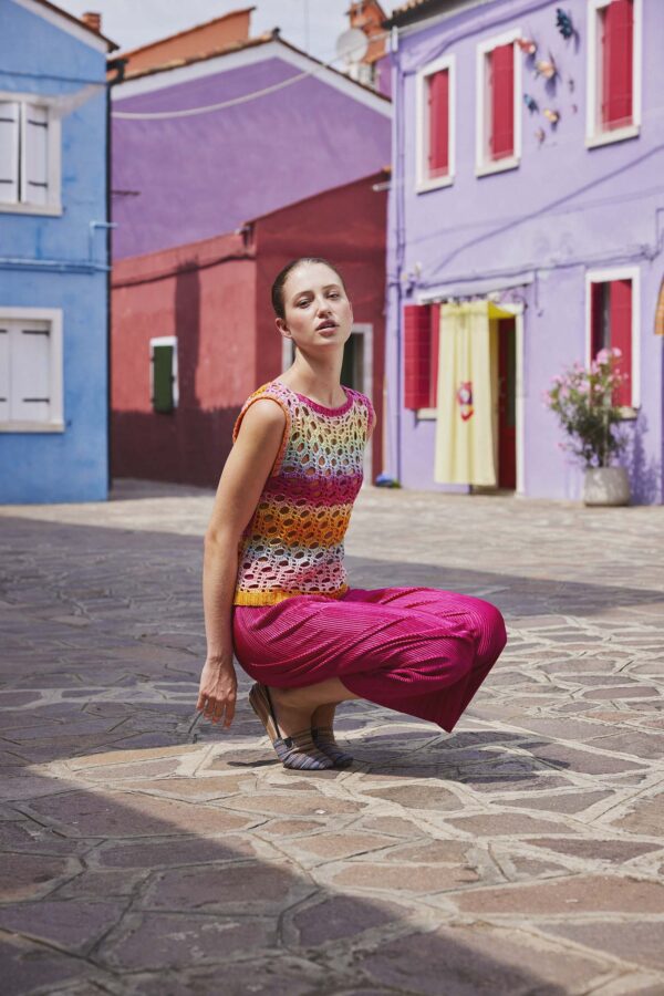 Welch großartiges Muster! Diese gerade, schlichte Tunika, mit rundem Ausschnitt trumpft mit Muster, Farbe und Garn. Das ausgefallene Muschelmuster bedarf nur 8 Reihen auf 10 Zentimeter. Es ist sehr luftig und daher eignet sich das Alpacagarn besonders gut. Dieses ist federleicht, hat einen leichten Flausch und temperaturausgleichende Eigenschaften. Nach dem Zusammennähen werden die Armausschnitte und der Halsausschnitt mit festen Maschen und Krebsmaschen umhäkelt. Sie sind wichtig für die Formgebung und sehen sehr edel aus. Da es bei diesem Kleidungstück entscheidend auf die Länge ankommt, sollte diese vor Beginn des Häkelns individuell bestimmt werden. Gehäkelt wird mit Nadel Nr 3,5. Das Alpaca-Garn ist von ggh. In der Anleitung wird die Tunika in den Größen 36, 38, 40, 42, 44 und 46 beschrieben.