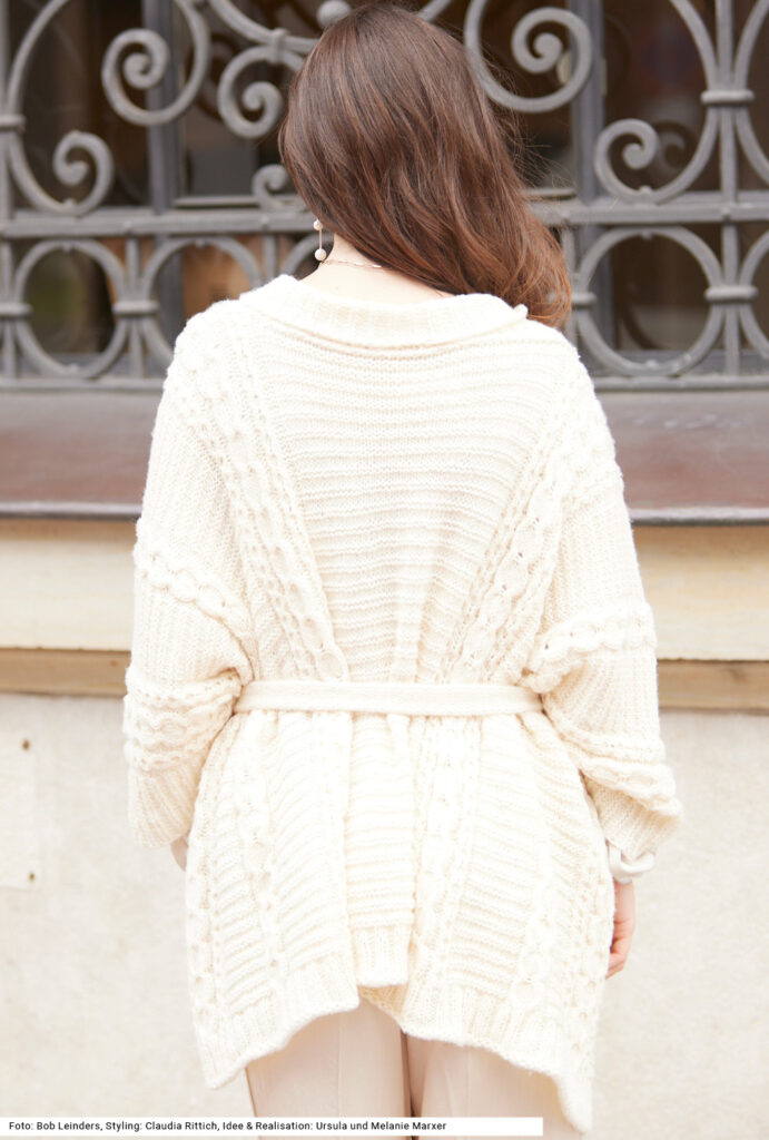 Wunderbar entspannt: Dieser in einem Stück gestrickte Poncho lässt sich einfach umlegen und offen tragen für einen relaxten Look. Wer es aber figurbetonter mag, nutzt das doppelt gestrickte Bindeband. Das Modell wird beidseitig der Mitte mit feinen Zöpfen sowie Querrippen verziert, die mitgestrickte Kragenblende lässt sich im Nacken umschlagen. Ein gutes Beispiel dafür, dass effektvolle Muster nicht unbedingt kompliziert sein müssen: Für die Zopfmuster werden jeweils lediglich eine bis zwei Maschen verkreuzt und nachdem die Maschen erst einmal für die Muster eingeteilt sind, geht es ganz unbeschwert und mit Nadelstärke 5 auch zügig voran.