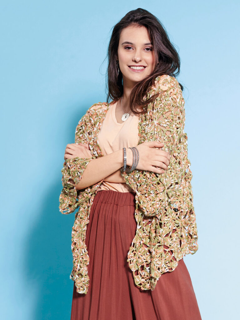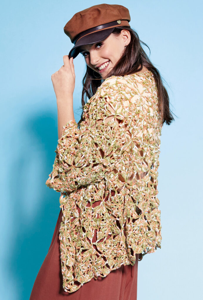 Unverzichtbar ist diese Jacke. Wie eine Stola zum schnell mal drüberziehen. Jedoch viel besser, denn die Jacke hat dreiviertellange Ärmel und ist vielseitig tragbar. Es gibt einen Schnittplan und eine Häkelschrift nach der 131 Dreiecke gehäkelt werden. Laut Schnittplan werden dann die Dreiecke aneinander gelegt. Ab der zweiten Reihe Dreiecke musst du sie an den Spitzen zusammen häkeln. Am besten, du machst Dir dafür einen original großen Schnitt. So kann alles was schon fertig ist auf dem Schnitt liegen bleiben und du siehst dein Werk enstehen. Gehäkelt wird mit Nadel Nr 3,5 und Garn von Woll-Butt. Die Anleitung gilt für die Einheitsgröße 36-40.