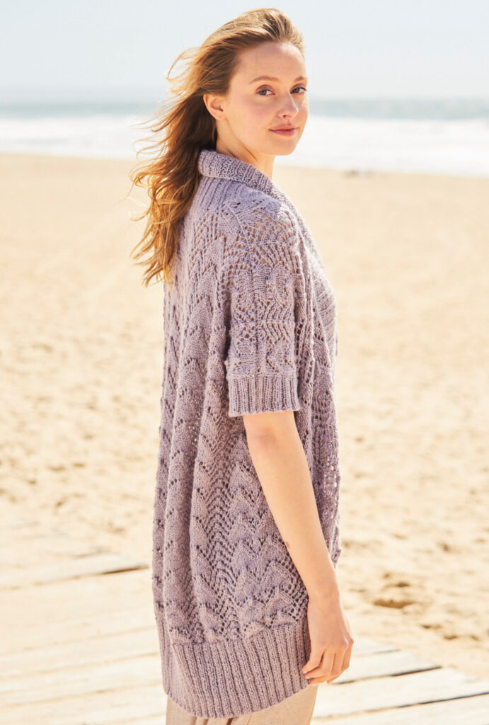 Dieses Modell ist eigentlich ein Überwurf, der offen getragen wird, es kann aber auch mit drei Knöpfen unten am hohen Bund geschlossen werden, sodass er den Charakter einer Weste erhält. Durch den breiten Schalkragen und das überaus weiche Garn aus einer Mohair-Babylama-Seide-Mischung kommen alle, die es kuschelig lieben, hier voll auf ihre Kosten. Zunächst werden Rückenteil und die Vorderteile gearbeitet, nach dem Zusammennähen wird dann der breite Rippenbund und der schmeichelhafte Schalkragen angestrickt. Die Anleitung passt für die Größen 38–42 und 52–56.