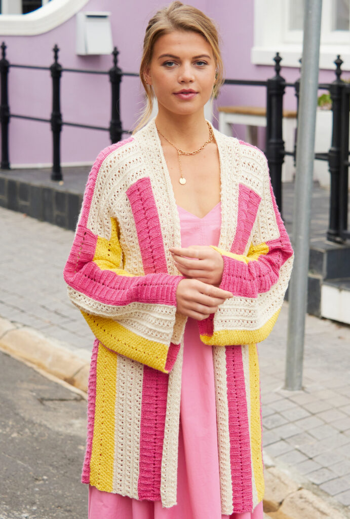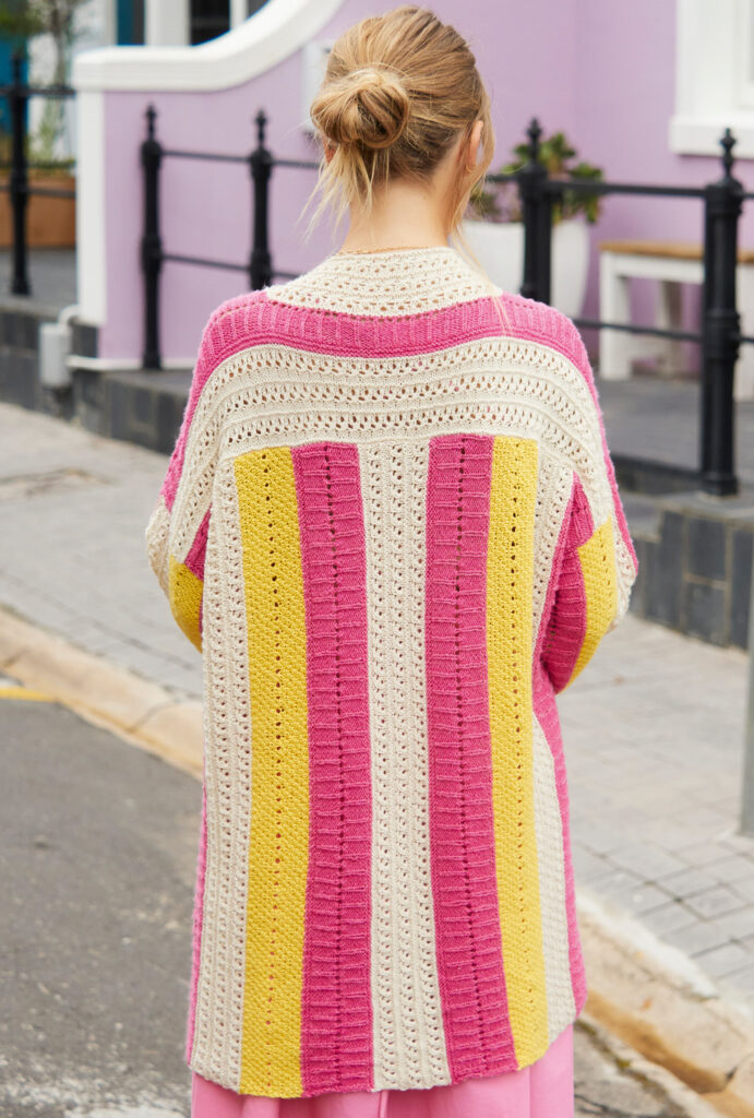 Sabrina Strickjournal Weiter Cardigan mit farbigen Musterstreifen in Natur, Pink und Gelb