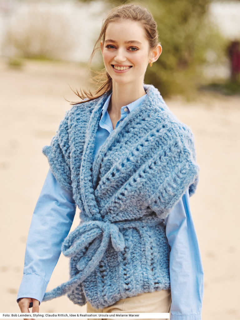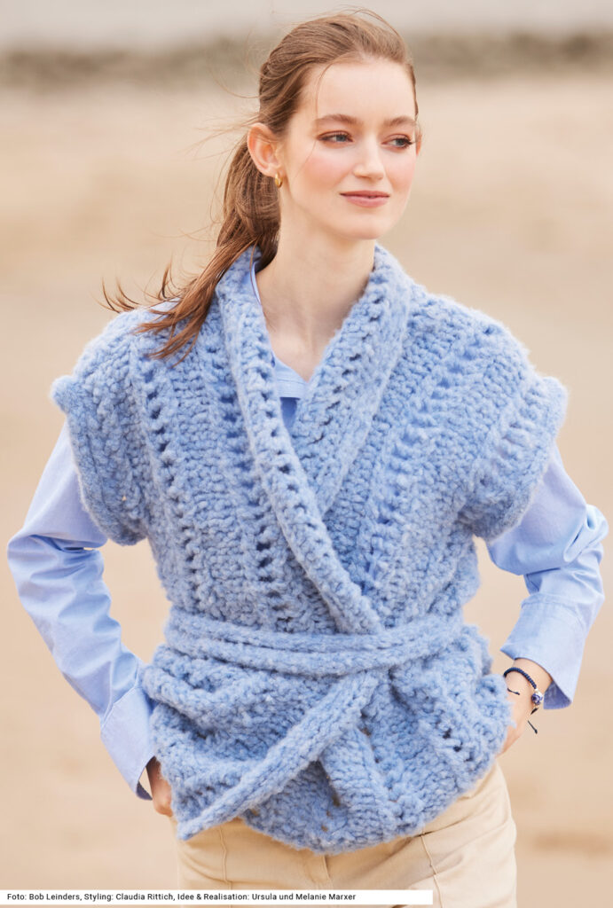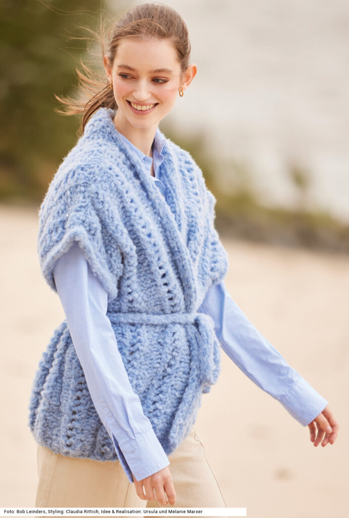 Diese modisch, sehr lässig geschnittene jeansblaue Oversize-Weste wird mit einem Gürtel geschlossen. Das volumige, besonders weiche Garn aus feiner Merinowolle und Alpaka mit etwas Polyamid liegt besonders weich auf der Haut und ist kuschlig warm. Die längs verlaufenden Loch-Rippen sind einfach zu stricken und mit 8er-Nadelngearbeitet ist die Weste im Nu fertig. Für den Gürtel wird ein langer I-Cord gestrickt. Auch um den Halsausschnitt läuft ein I-Cord. Eine Anleitung steht in den Größen 36 – 40 und 42 – 46 sowie 48/50 bereit.