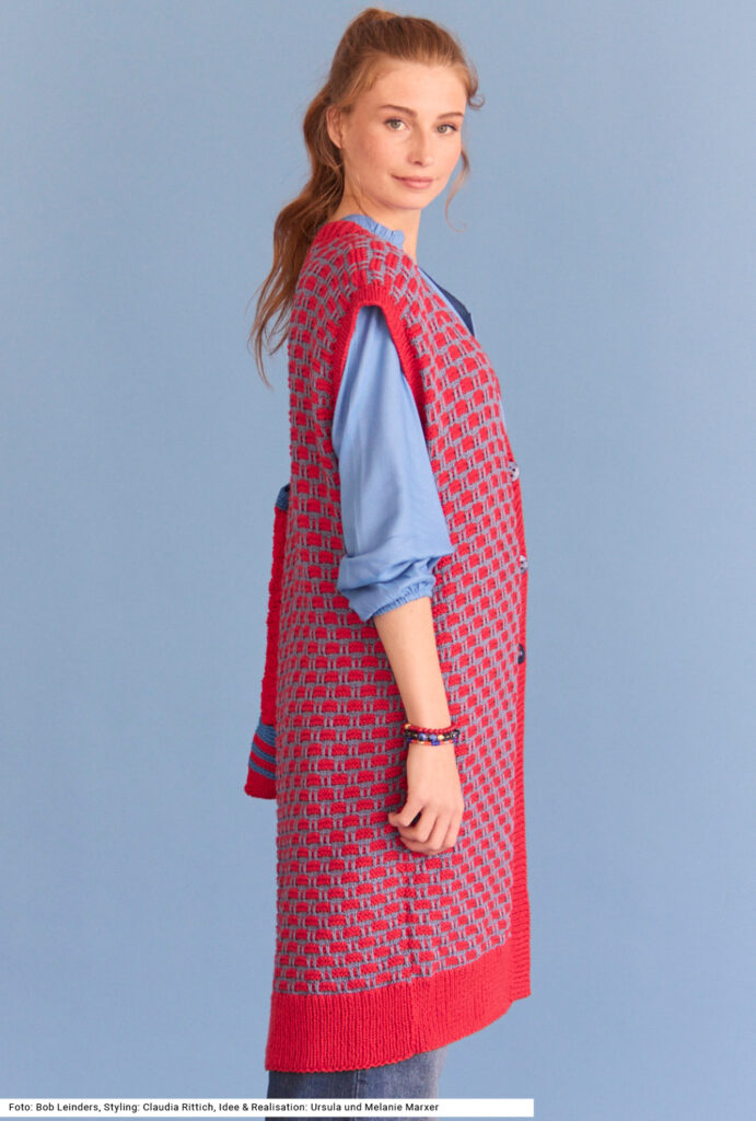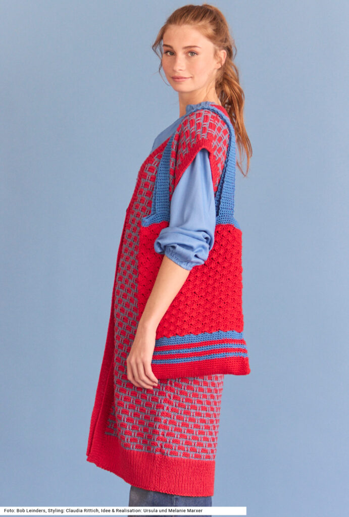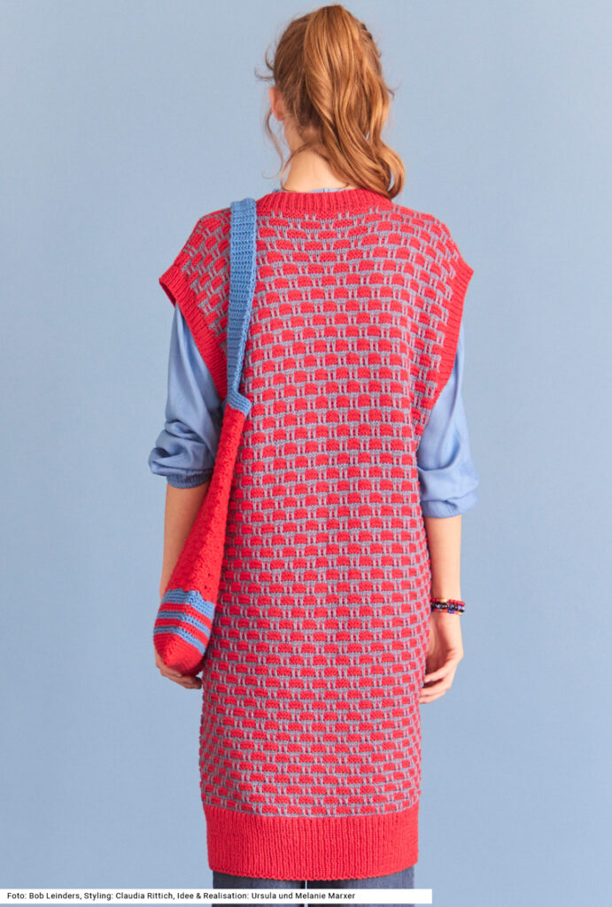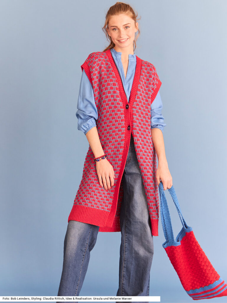 Ausgehbereit mit einem Set aus gestrickter Weste und gehäkelter Tasche. Die Weste hat ein einfaches Hebemaschenmuster aus zwei Farben, die Tasche ebenfalls in den gleichen Farben, jedoch mit einem anderen Garn gearbeitet. Bei der Weste ist es aus Baumwolle und Viskose, bei der Tasche aus reiner Baumwolle. Die Häkeltasche mit zwei Henkeln wird mit festen Maschen und einem Muschelmuster gearbeitet. Bei der langen Weste werden die Knöpfe nur im oberen Bereich angebracht. Zum Schluss werden die Armausschnitte und die vordere Blende im Rippenmuster gearbeitet, wie auch zuvor der Bund. Eine Anleitung gibts für die Größen 38/40, 42/44 und 46/48.