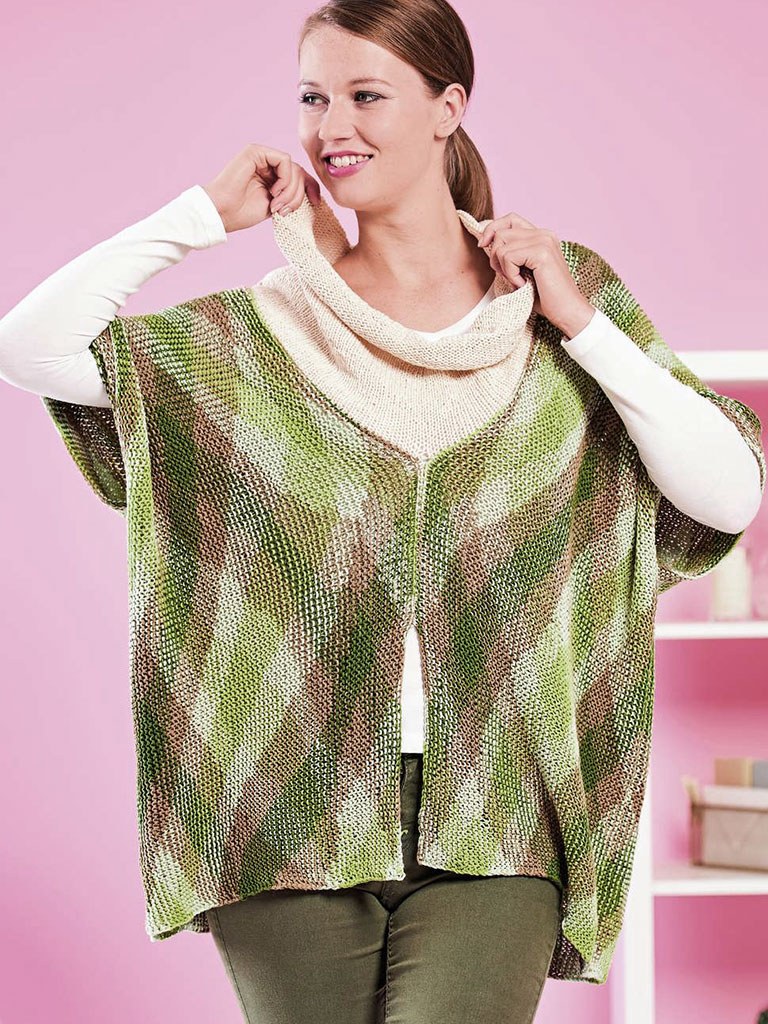 Ein Poncho zum Reinkuscheln und Wohlfühlen! Der Poncho ist vorn offen und kann nach Belieben mit einzelnen Schließen geschlossen werden. Der Schalkragen in Beige schützt auch bei ungemütlichem Wetter vor dem Wind und gibt am Hals schön warm. Das Garn, die Woolly Hugs POOL, hat einen speziell ausgetüftelten Farbverlauf der durch einen Trick zu diesem Karomuster wird. Diese Art zu häkeln oder stricken heißt Planned Pooling und wird in dieser Anleitung natürlich genau erklärt. Das Geheimnis von Planned Pooling liegt im Garn versteckt. In regelmäßigen Abständen ändert sich die Farbe des Garns und es entstehen die gleichen Effekte wie bei einem Farbwechsel – nur viel einfacher! Und somit kann man tolle Effekte ganz leicht zaubern. Komplettiert wird der Poncho mit dem Uni Garn.