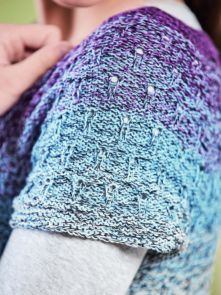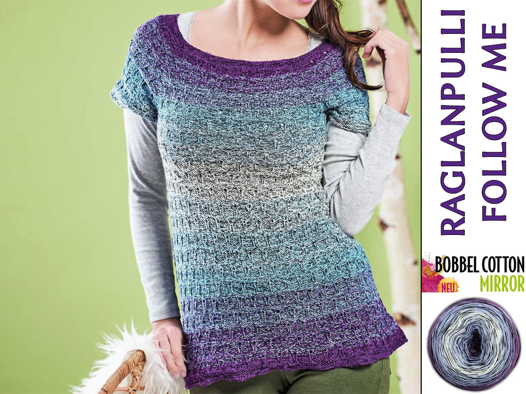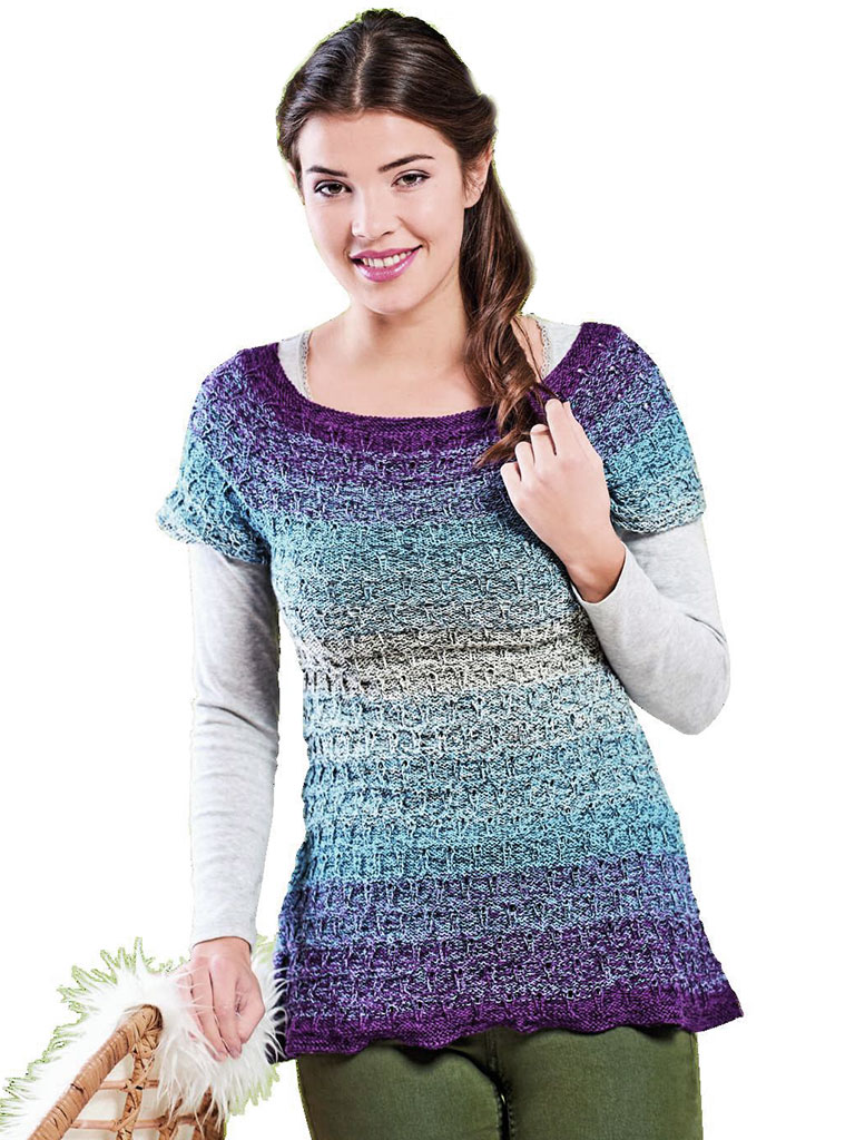 Schöne harmonische Farben in einen gespiegeltem Verlauf, kurze Ärmel und ein längerer Schnitt bis zur Hüfte machen diesen Pulli aus. Gespiegelter Verlauf bedeutet, dass die Farben sich nach der Hälfte spiegelverkehrt wiederholen. Wie hier von einem schönen Lila über Blau zu Hellblau und wieder zurück. Der Pullover wird von oben nach unten in einem Stück gestrickt. Das süße kleine Lochmuster wird durch einige rechte Maschen betont und ist so leicht zu merken, dass es locker nebenbei (z.B. an einem Fernsehabend) gestrickt werden kann. Der einfache Schnitt kann ganz leicht an jede Größe angepasst werden.