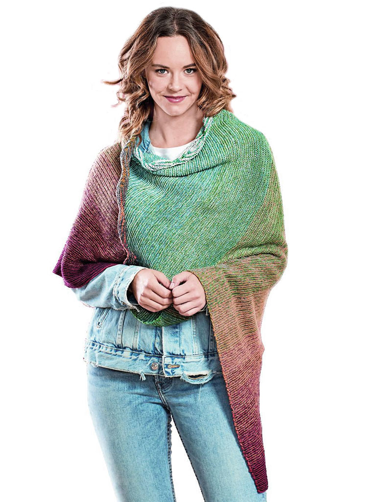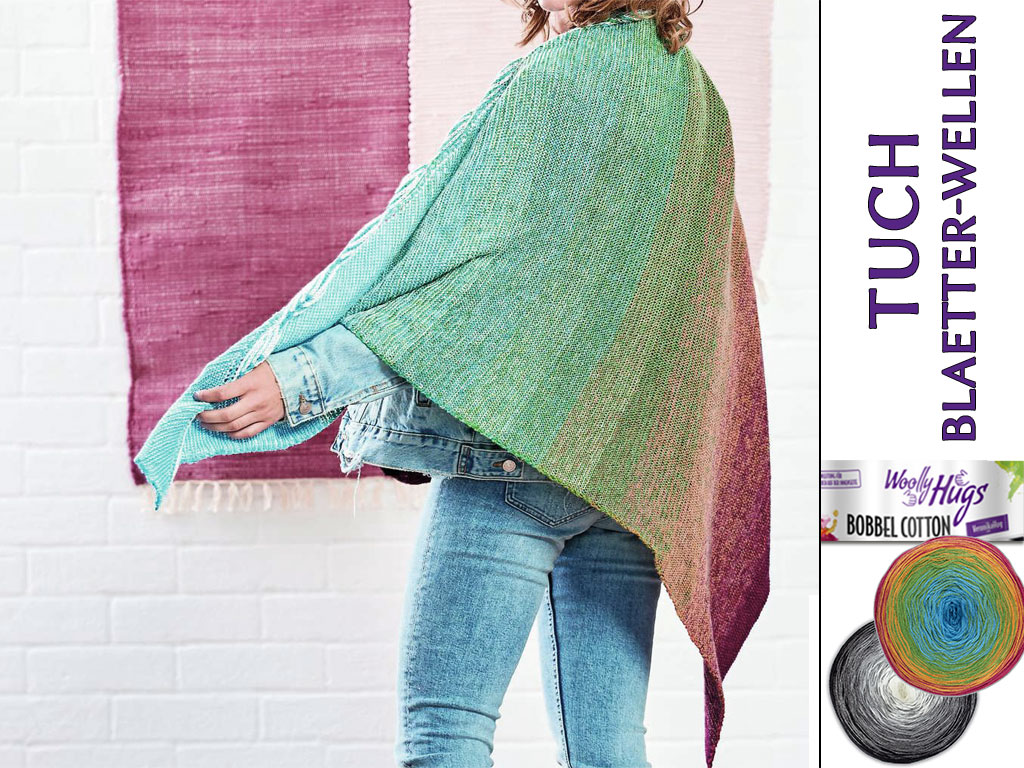 So schön zum Reinkuscheln ist diese riesige farbenfrohe Tuch. Es ist ganz einfach gestrickt mit einem wunderschönen Wellenrand. Von der Spitze angefangen kannst du das Tuch so groß stricken wir du magst. Hier gilt jedoch, je größer, desto mehr zum reinkuscheln! Da es mit 2 Bobbeln gestrickt wird, ergibt sich durch geschicktes wechseln der Farben in jeder Reihe ein sehr interessanter Effekt, der durch das Patentmuster am Rand noch betont wird. Tipp: Die Woolly Hugs Bobbel haben neue Farben dazubekommen, sodass für jeden Geschmack das Richtige dabei sein wird.
