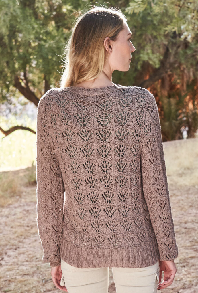 Bio, fair, vegan – das sind die Attribute, mit der sich die hellbraune Jacke schmücken kann. Denn die Bio-Baumwolle wird mit Soja kombiniert, ist herrlich weich und leicht glänzend. Dazu kommt der klassische Schnitt, gepaart mit dem femininen Lochmuster und einer zeitlosen Farbe – diese Jacke trägt man ganz sicher nicht nur eine Saison! Gestrickt wird hier auch ganz klassisch: In Einzelteilen von unten nach oben. Begonnen wird mit dem Rippenbündchen, danach geht es im gar nicht so komplizierten, aber sehr wirkungsvollem Ajourmuster weiter. Das macht Spaß, zumal das Garn so angenehm über die Nadeln gleitet und ein sehr sauberes Maschenbild ermöglicht. Sind beide Vorderteile, das Rückenteil und die Ärmel fertig gestrickt, werden erst einmal die Schulternähte geschlossen. Danach erhalten sowohl die Verschlussränder, als auch der Halsausschnitt ihre Blenden. Zum Schluss nur noch die Ärmel einsetzen die restlichen Nähte schließen und die Knöpfe annähen. Am besten bekommt die Jacke vor den ersten tragen noch ein kleines Bad und wird liegend schön ausgestrichen getrocknet. Dadurch legt sich das schöne Lochmuster richtig und entfaltet seine ganze Schönheit.