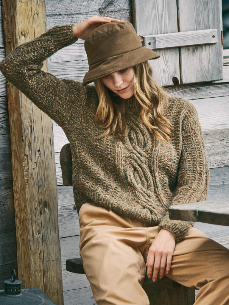 Ein rustikaler Augenschmaus und kuscheliger Alltagsbegleiter wartet hier auf dich. Gestrickt wird dreifädig. Das führt zu einer entzückenden Farbmelange in Verbindung mit dem tollen Musterbild auf Rippen und Zopf. Die gerade Passform und die Armkugeln sorgen für einen legeren Tragekomfort. Das Rippenmuster und falsche Patent sind interessant zu stricken und lassen keine Langeweile aufkommen. «Herzstück» des Pullovers ist aber der plastische Zopf, der sich in der Mitte befindet. Gestrickt wird in Nadelstärke 7 und 8, das Garn gibt es bei GEDIFRA. Ein tolles Modell mit überschnittenen Schultern, das dir richtig viel Freude machen wird. In der Anleitung findest du die Größen 38/40 und 44/46.