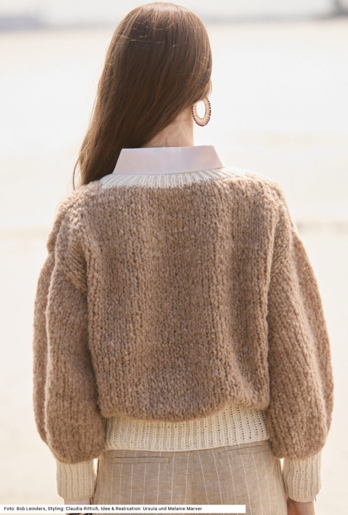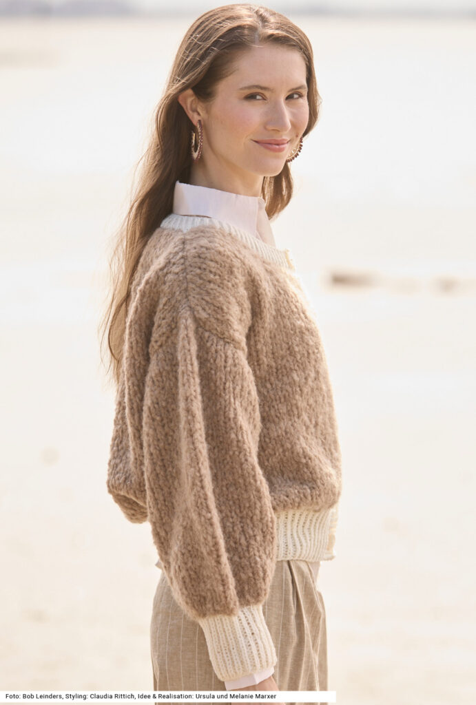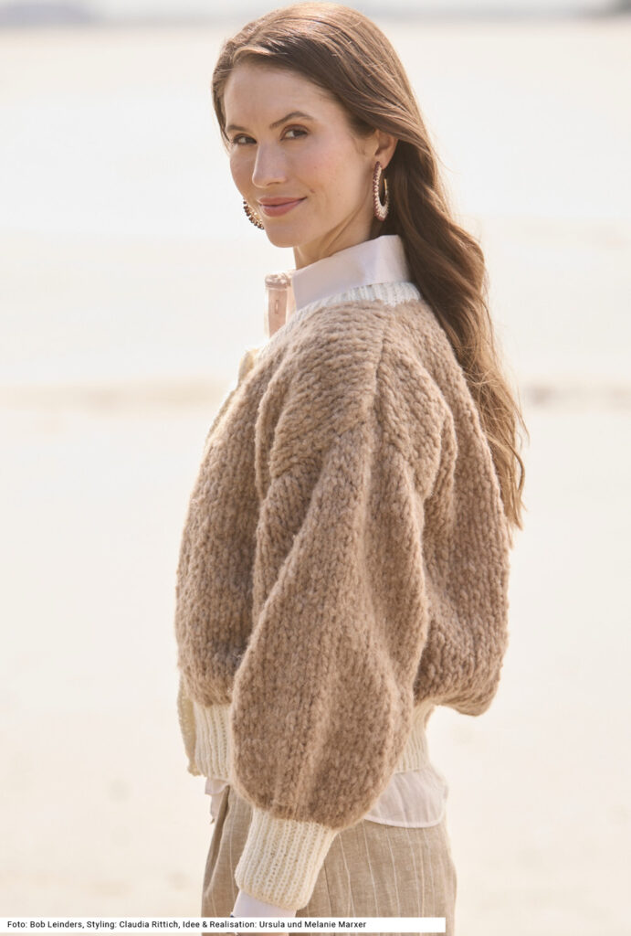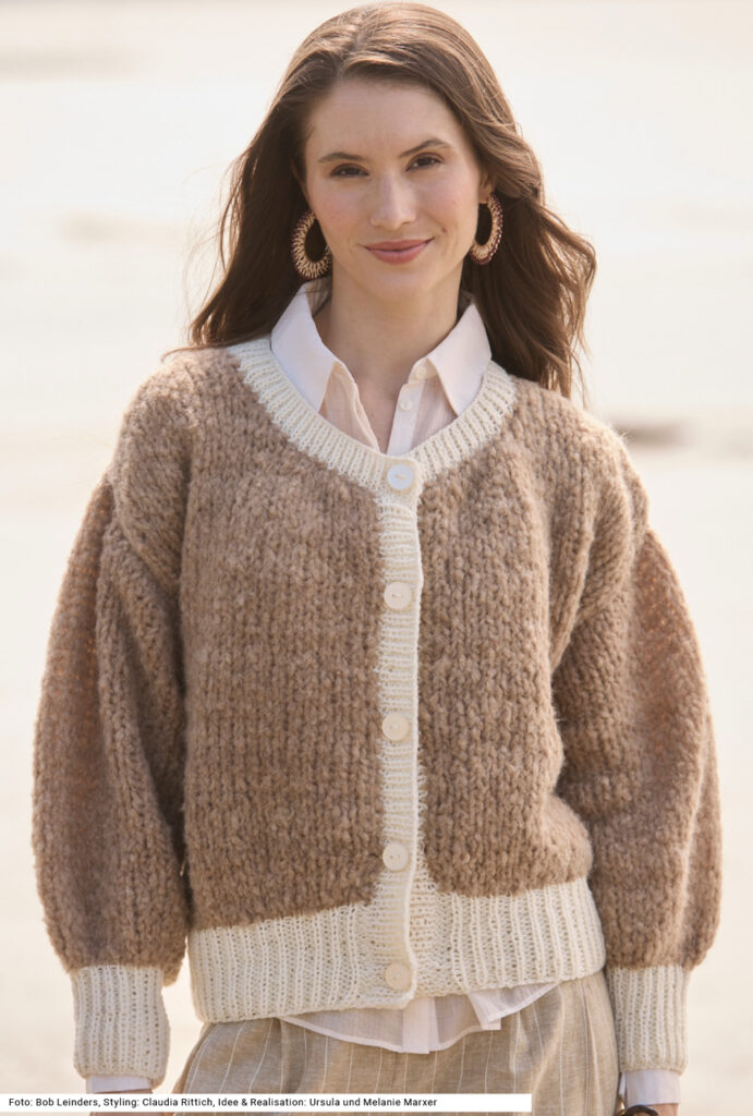 Diese Jacke ist der Inbegriff von gemütlichem Luxus. Flauschig, weich und ultraleicht (sie wiegt je nach Größe nur 300 bzw. 400 oder 450 g) begleitet dich perfekt durch kühle Tage. Der Mix aus klassischen Halbpatent-Bündchen und voluminösem Glatt-rechts-Strick macht die boxy geschnittene Jacke zum absoluten Must-have – stylisch, charmant und kuschelig zugleich. Durch die unterschiedliche Dicke der Garne bekommen alle Teile nach dem Bund eine voluminöse Weite. Da ist zum einen das dicke Garn aus Wolle, Alpaka und Polyamid und zum anderen das dünnere aus reiner Schurwolle. Eine Anleitung gibts für die Größen 36/38, 40/42 und 44/46.