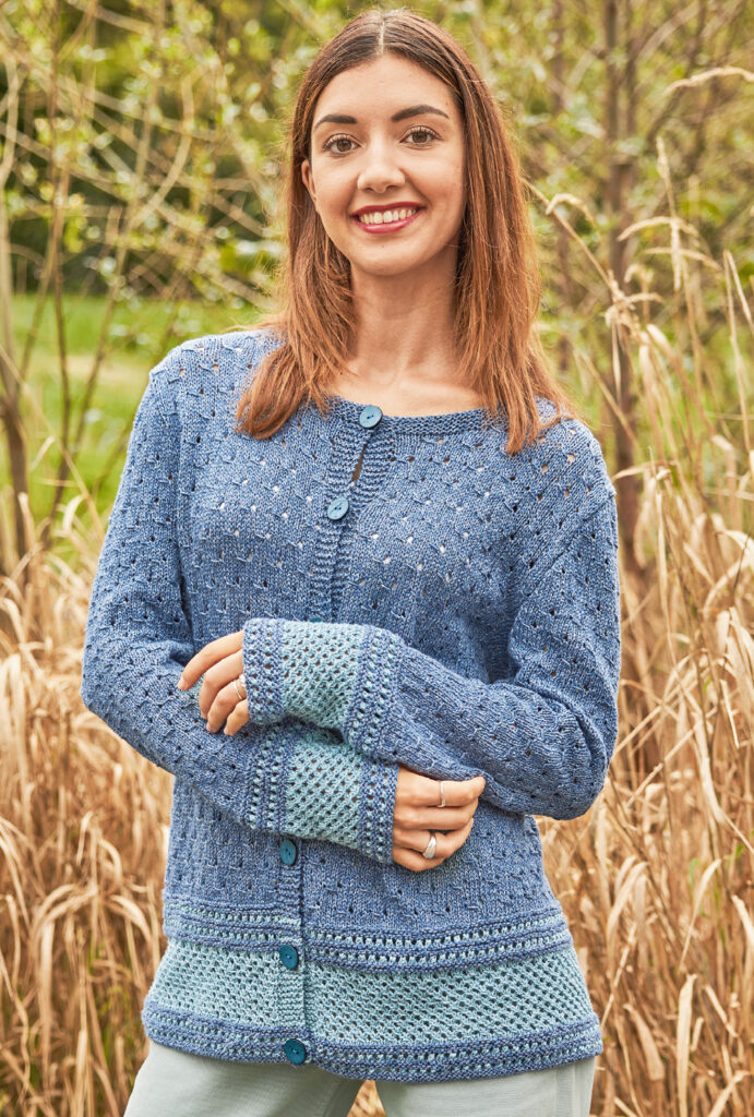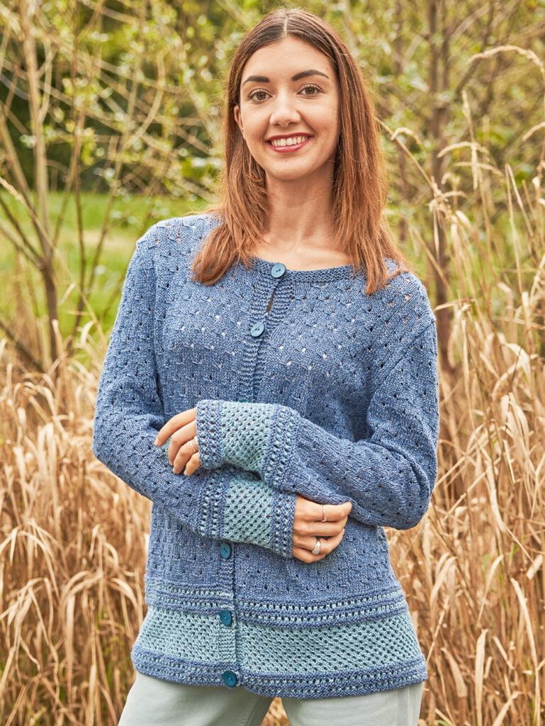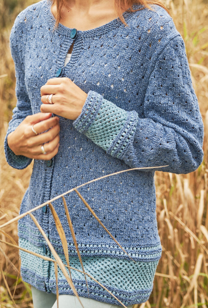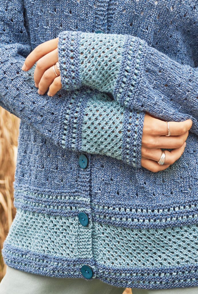 Perfekter Begleiter an kühlen Sommerabenden: Diese in einem Jeans- und einem Gletschereiston mit PRO LANA „Montenegro“ gestrickte Langarmjacke mit Knöpfen wärmt abends im Sommer und komplettiert das Outfit an lauen Frühlingstagen. Gestrickt wird kraus rechts, im Lochmuster sowie zwei verschiedenen Strukturmustern. So entstehen an den Ärmeln und am unteren Saum dekorative Abschlüsse, die der Jacke das gewisse Etwas geben. Die ausführliche Strickanleitung für die Größen 36/38, 40/42 und 44/46 inklusive Schnittzeichnung und zwei Strickschriften erleichtert das Nachstricken auch für etwas ungeübtere Strickerinnen.