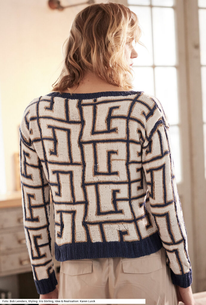 Mäandernd wie in einem Labyrinth durchzieht das großflächige Jacquardmuster in drei Farben den ganzen Pulli. Es dominiert Weiß durchzogen von marinefarbenen Linien, die mit Beige umrandet sind. Die Rippenbündchen und die Blende um den runden Halsausschnitt sind ganz in Marine gehalten. Je nach Begleitung, ob mit beiger Hose oder dunkelblauem Rock wirkt das Muster immer wieder anders. Gearbeitet aus reinem Seidengarn ist dieses Modell wirklich ein Hingucker. Die Anleitung dazu steht in den größen 36, 38/40 und 42/44 zur Verfügung.