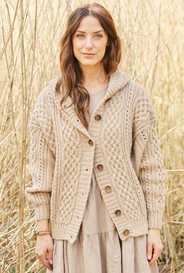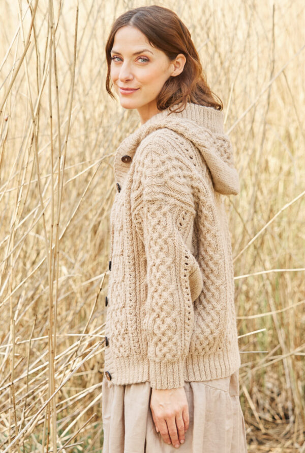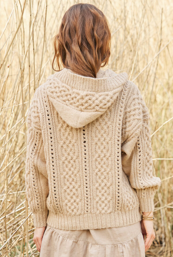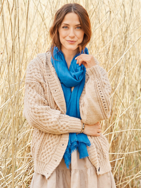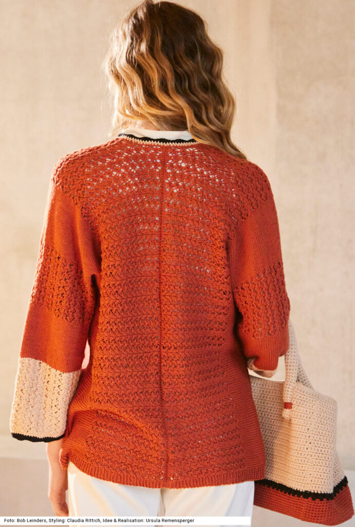 Mit diesem Set bist du fürs Büro perfekt angezogen. Die quer gestrickte, verschlusslose Jacke ist dezent, bekommt aber dank der breiten Ajourmuster-Bordüre mit gehäkeltem Abschluss an den Vorderteilen eine besondere Note. Die gehäkelte, stabile Tasche ergänzt den Look. An der Tasche ist noch ein kleines Gimmick: ein Label. Das Ajourmuster wiederholt sich bei den Ärmeln. Dank des Garns aus Baumwolle und Kaschmir sind beide Modelle wunderbar angenehm zu tragen. Eine Anleitung gibt es für die Größen 38/40, 44/46 und 50/52, Tasche: 28 x 48 cm.