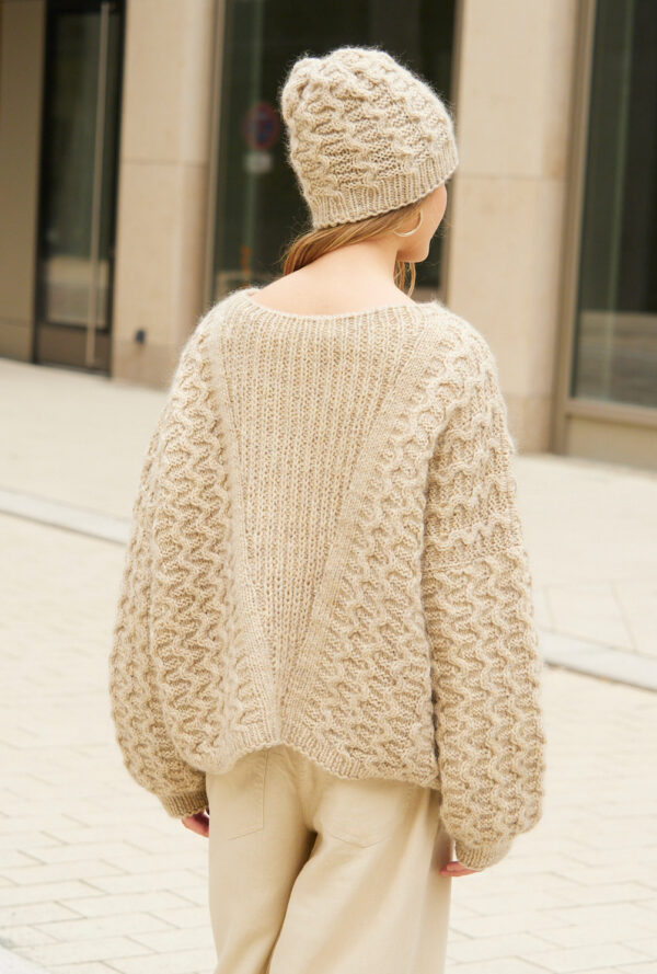 Quergestrickter Pullover im Zopfmuster mit Mütze