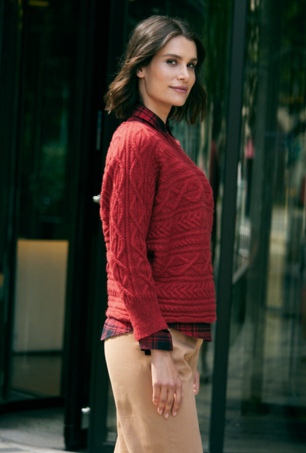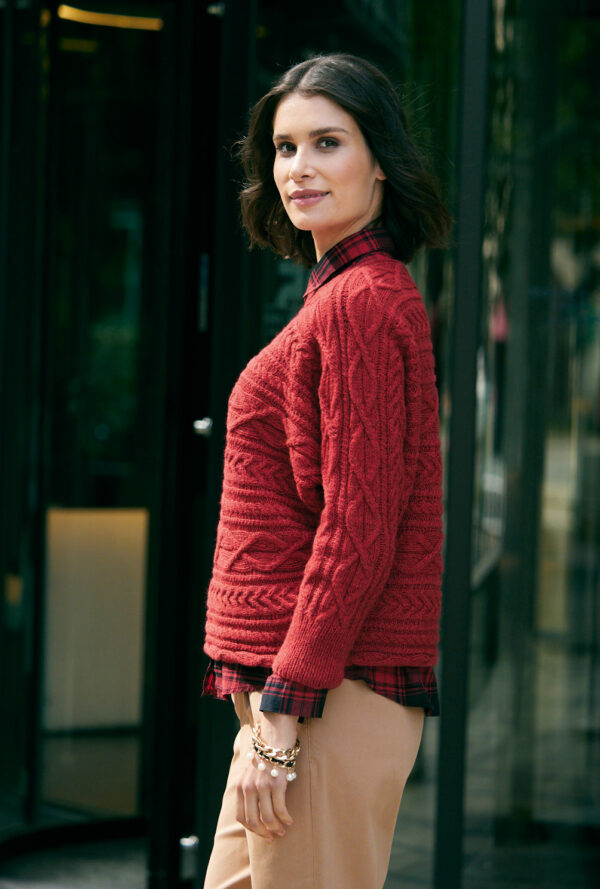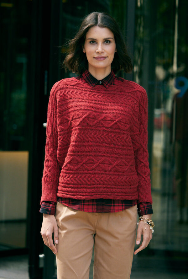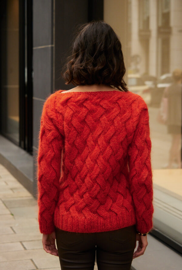 Roter Pulli mit Zopf-Rautenmuster