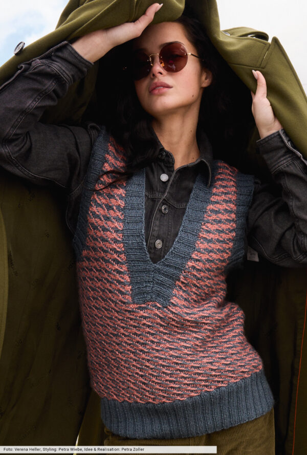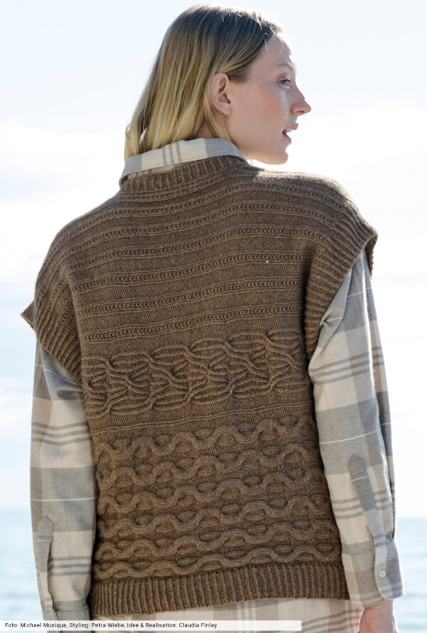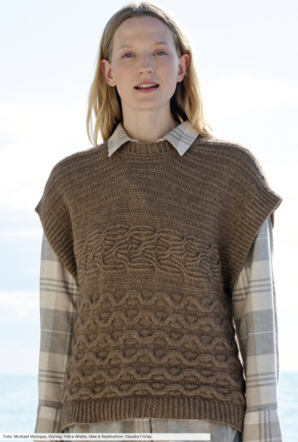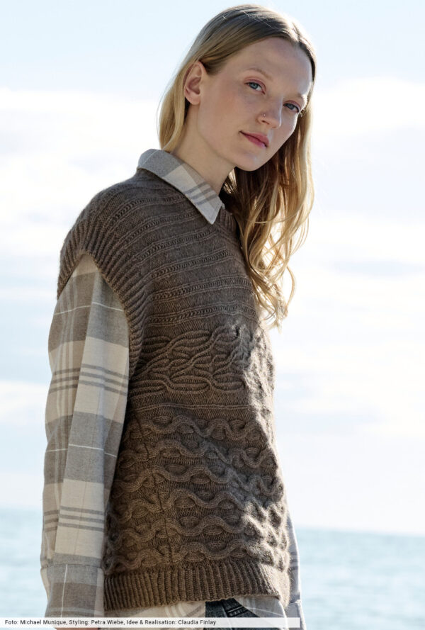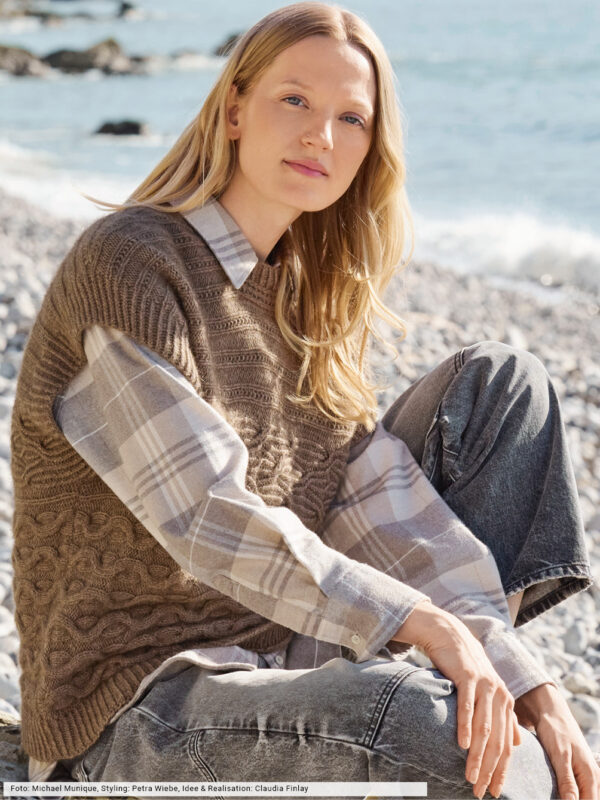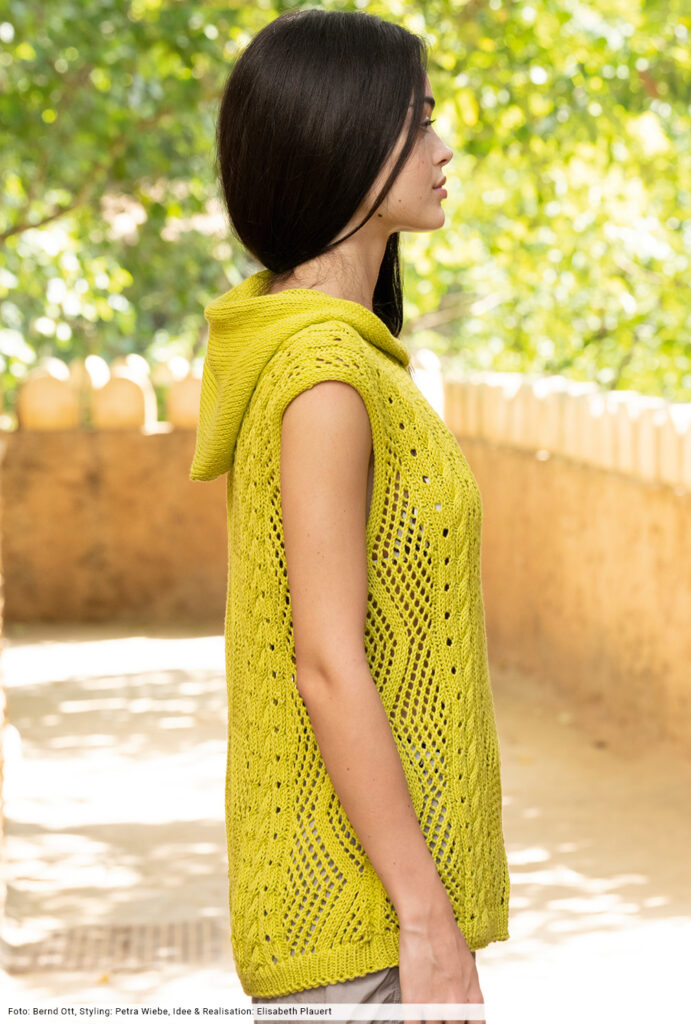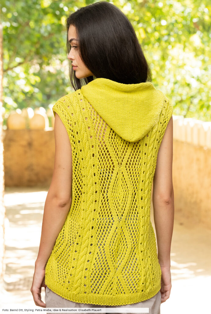 Transparente Lochrauten und schmale Zöpfe bilden bei diesem Top – das übrigens auch als Pullunder getragen werden kann – die unvergleichlich schöne Musterstruktur. Aus hochwertiger Öko-Baumwolle in strahlendem Limone ein echtes Highlight, das durch die glatt rechts gestrickte Kapuze den sportiven Charakter erhält. Elastische Rippenbündchen an der Saumkante und die in I-Cord-Technik gestrickten Blenden an den Armausschnitten und am Kapuzenrand bilden das Finish.