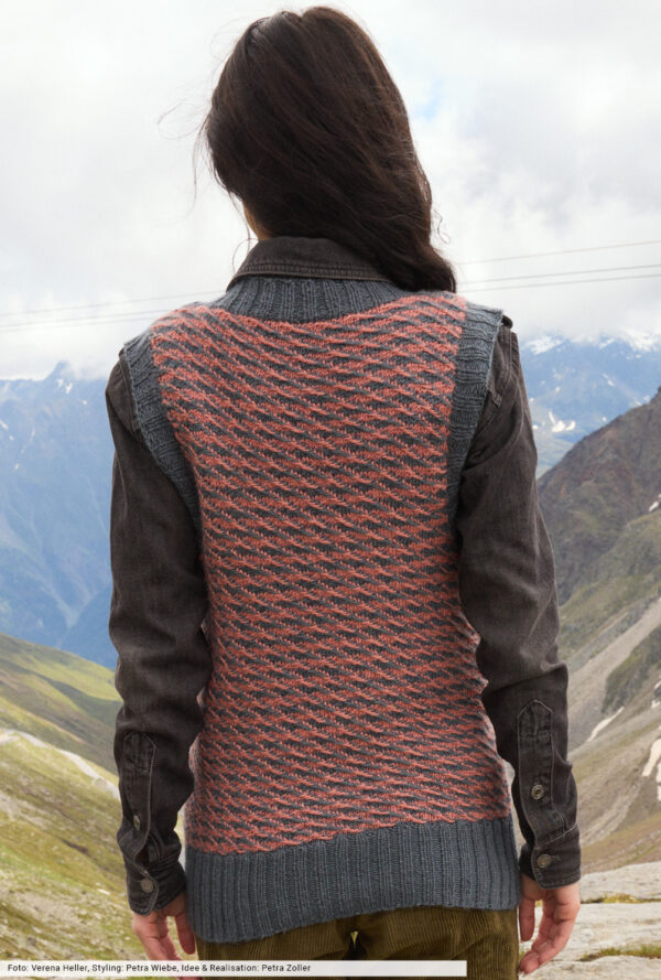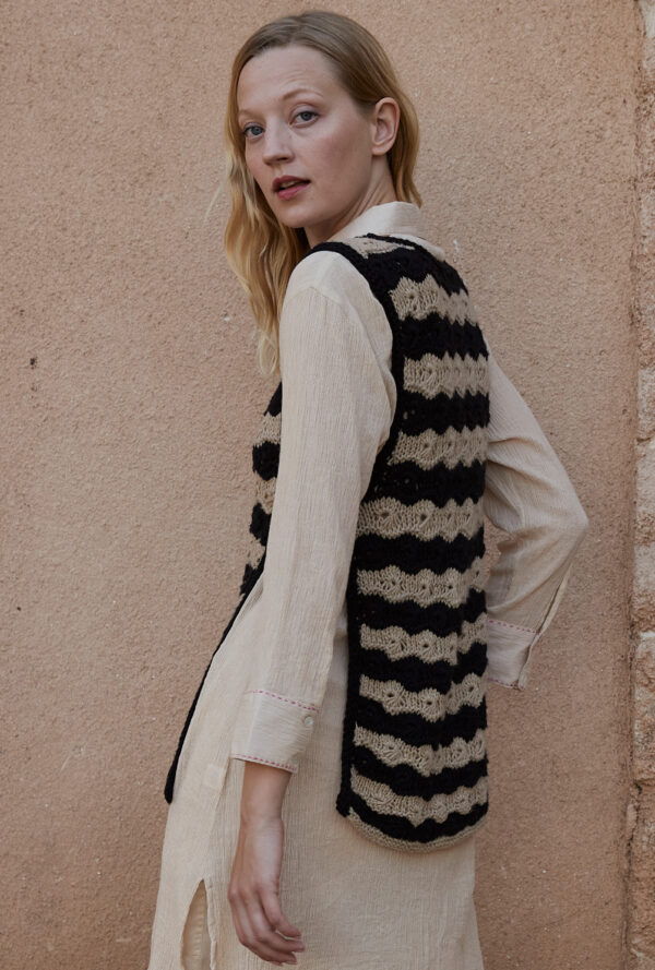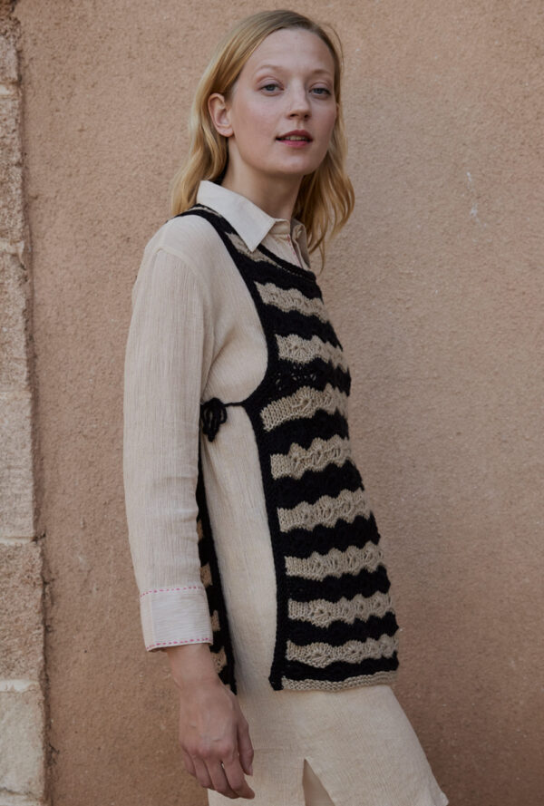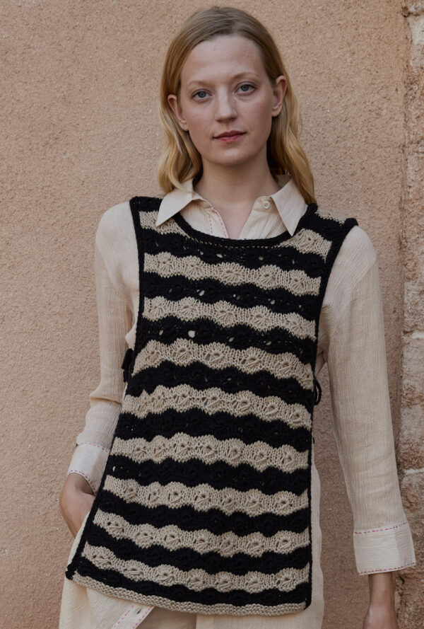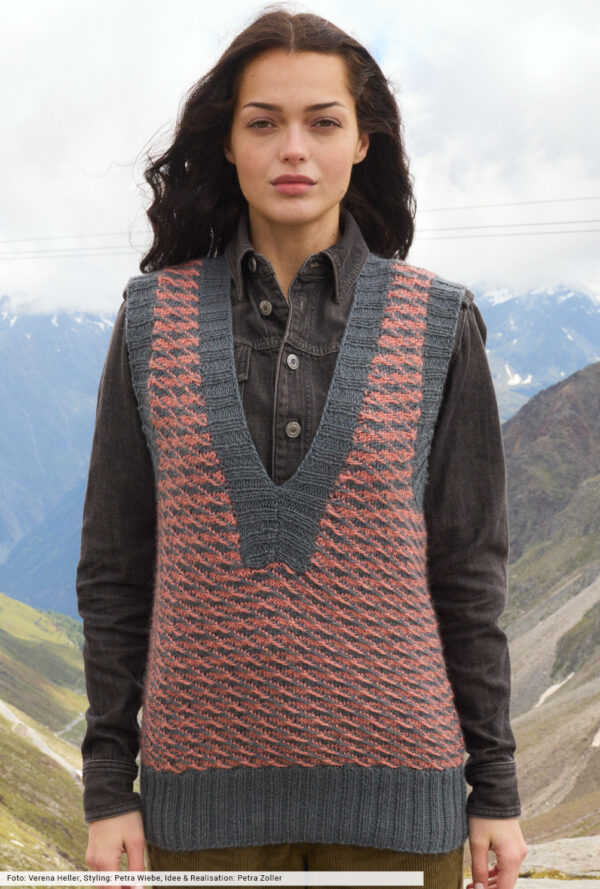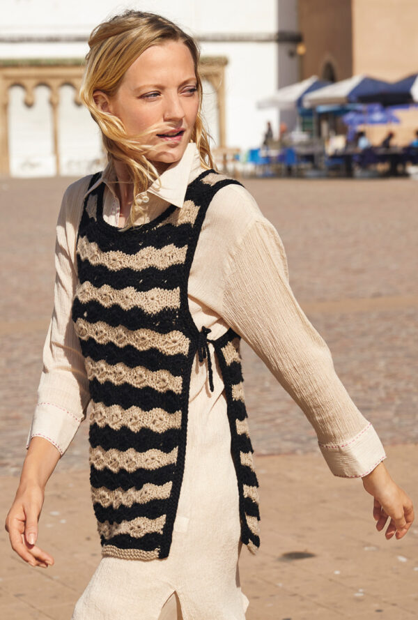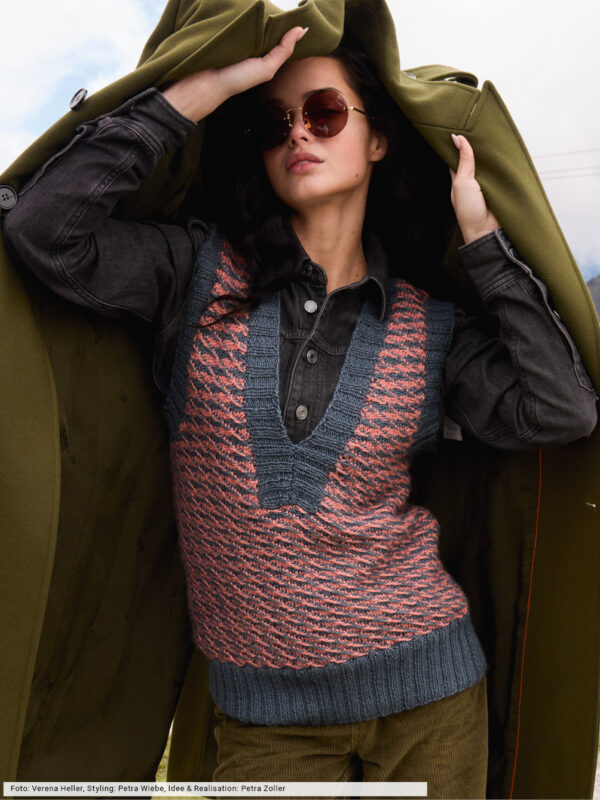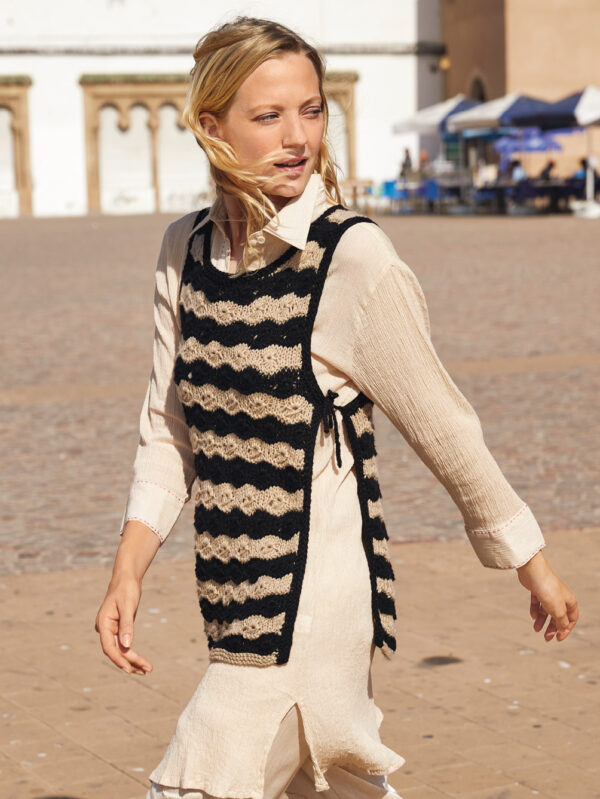 Transparente Lochrauten und schmale Zöpfe bilden bei diesem Top – das übrigens auch als Pullunder getragen werden kann – die unvergleichlich schöne Musterstruktur. Aus hochwertiger Öko-Baumwolle in strahlendem Limone ein echtes Highlight, das durch die glatt rechts gestrickte Kapuze den sportiven Charakter erhält. Elastische Rippenbündchen an der Saumkante und die in I-Cord-Technik gestrickten Blenden an den Armausschnitten und am Kapuzenrand bilden das Finish.