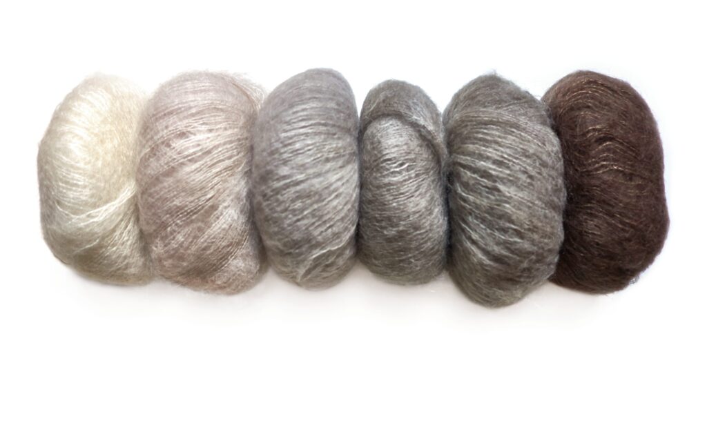 Die Mohair Luxe und die Mohair Luxe Paillettes von hell nach dunkel anordnen. Die Anordnung für unser Beispielmodell: Farbe 175, 075, Mohair Luxe Paillettes 075, 275, 087, 062.
