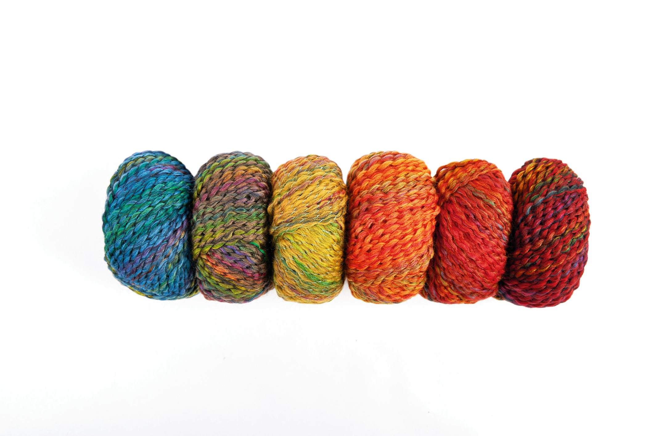 Lebhafte Intensität erzeugen auch Farbverläufe aus Multicolor- Garnen. Wichtig bei der Farbauswahl ist lediglich, dass sich in jedem Folgegarn Farbsprengsel der vorherigen Farbe wiederfinden.