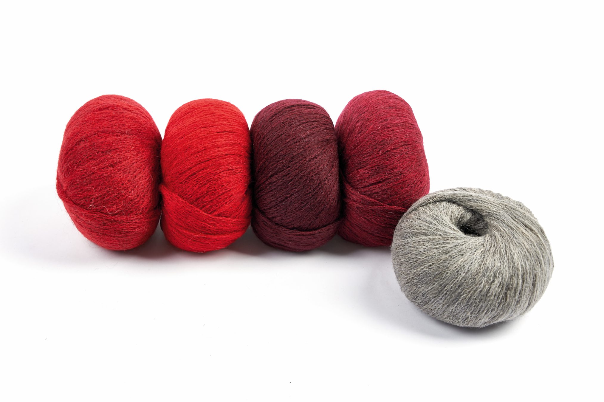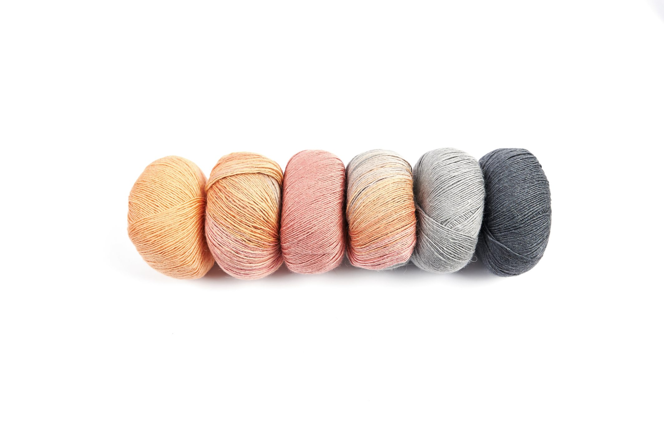 Von Sockengarnen bis zu edlen Kaschmir-Seidenmischungen kann nahezu jedes Garn verwendet werden. Um auszuschließen, dass die eine oder andere kräftige Farbe eventuell ausblutet und die zarten Abschnitte verfärbt, sollte auf jeden Fall eine Maschenprobe gearbeitet und auch gewaschen werden.
