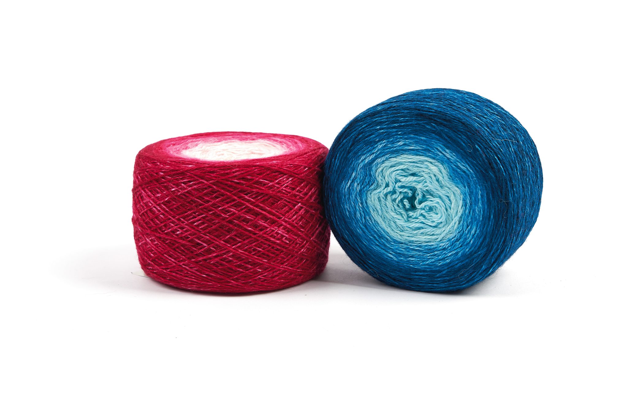 Auch Garne, die bereits einen Farbverlauf mitbringen, kann man gut für eigene Kreationen verwenden. Wenn sich, wie bei unserem Beispiel, in den Knäueln mit unterschiedlichen Farbnummern annähernd identische Farbabschnitte finden, lassen sich diese sehr vorteilhaft für fließende Farbübergänge nutzen.