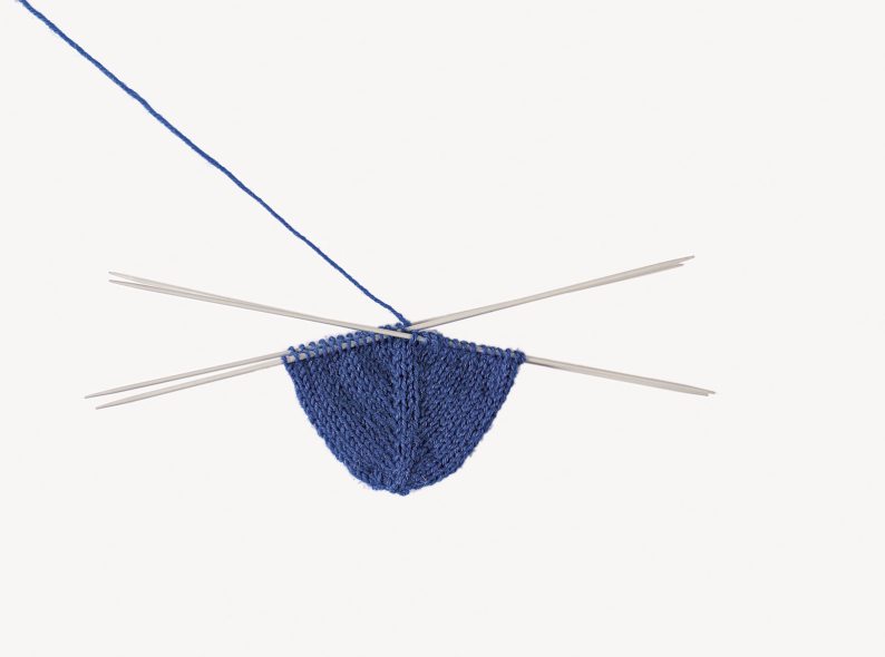 Für das Käppchen über den mittleren Sohlen-Maschen der 3. und 4. Nadel in Reihen weiterarbeiten, die Maschenzahl ist der Anleitung zu entnehmen.