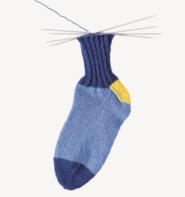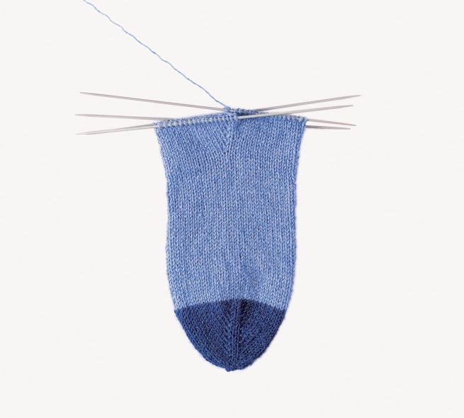 Info: Bei großen Sockengrößen kann es vorkommen, dass auch Maschen des Fußrückens mit ins Käppchen eingestrickt werden.