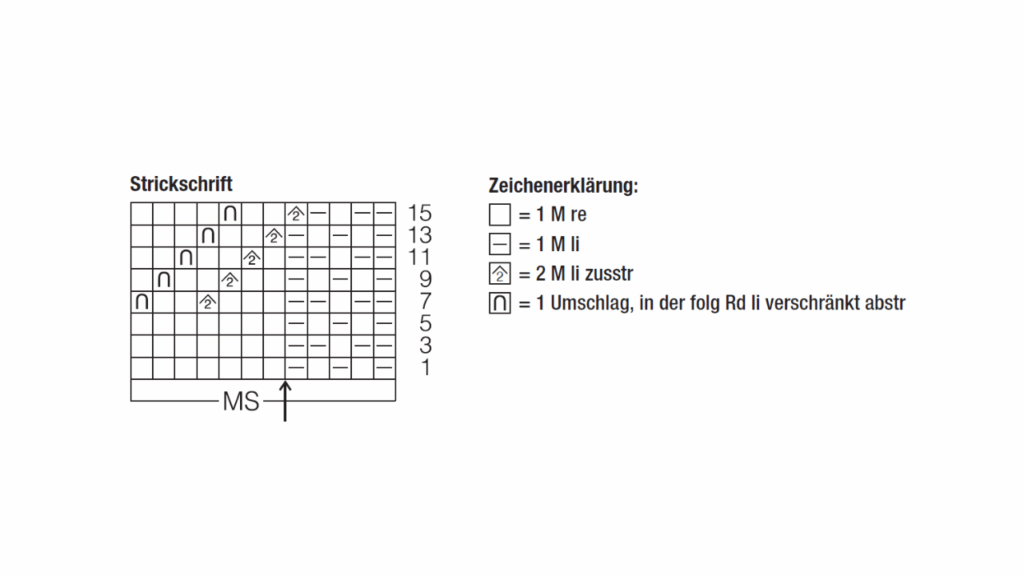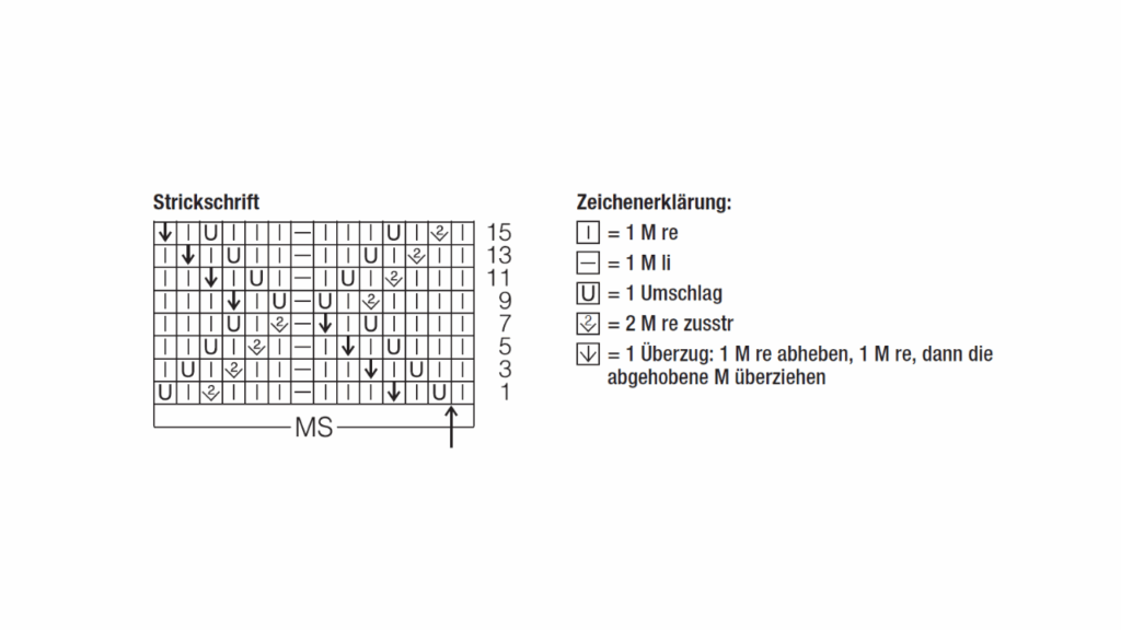 Ajourmuster über 29 Maschen: Laut Strickschrift arbeiten. Es sind nur die ungeraden Runden gezeichnet. In den geraden Runden alle Maschen stricken, wie sie erscheinen, Umschlag rechts stricken. Den Mustersatz 2 x wiederholen, enden mit der ersten Masche vom Mustersatz. Die 1.-16. Runde stets wiederholen.
