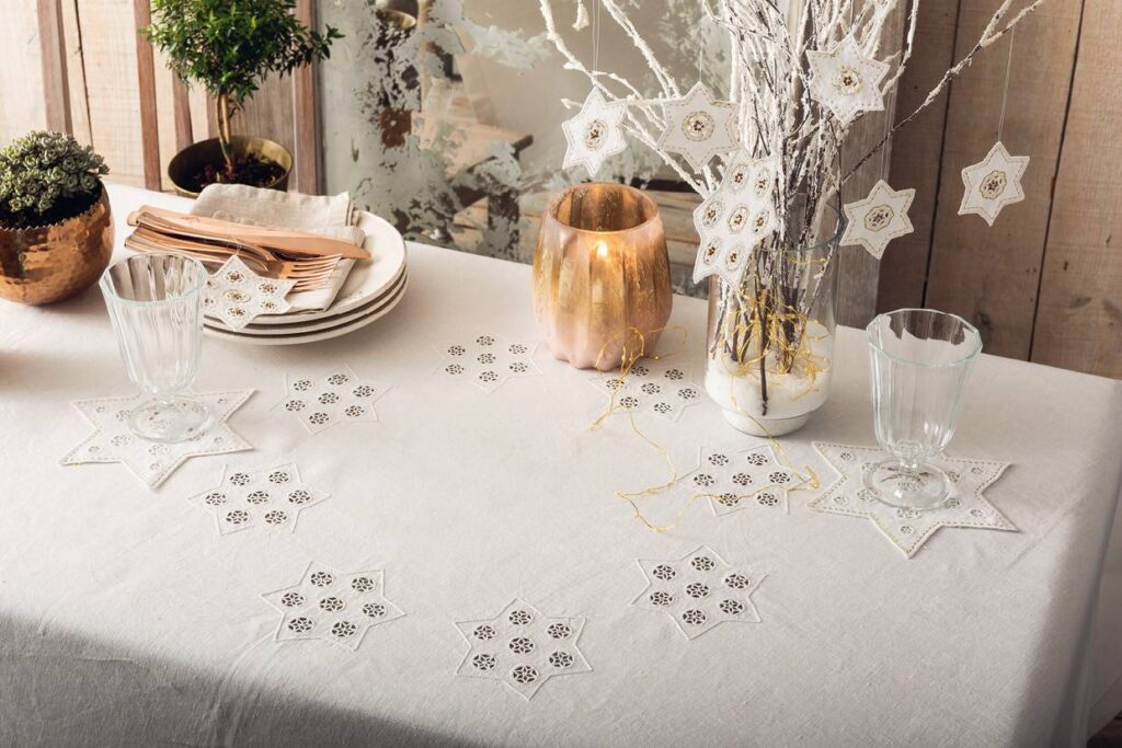 Ein weihnachtlicher Tischläufer in Rot, Weiß oder Gold, versehen mit Häkelmotiven, verwandelt jeden Tisch in eine festliche Tafel.