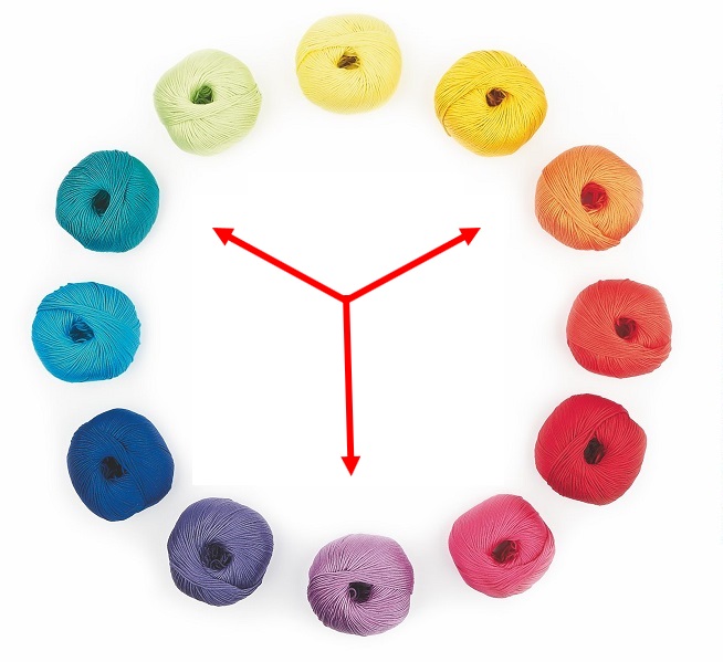 Kontrastreiche Dreiergruppen bestehen aus Farben, die in Abständen zueinander liegen und eine Dreiecksform bilden. So wie die drei primären Farben Gelb, Rot und Blau.