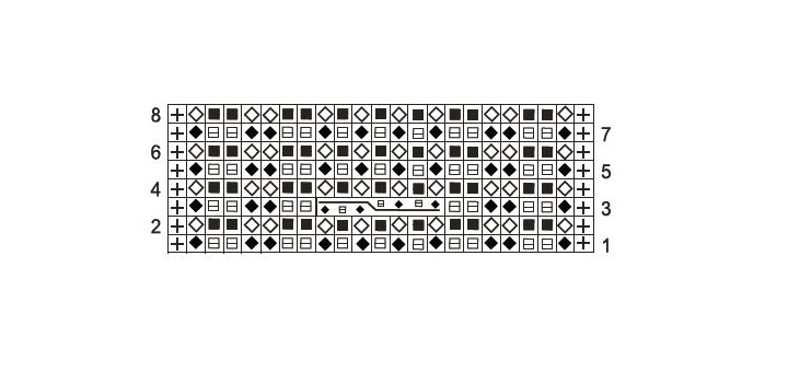 = 7 Maschen nach links verkreuzen: 3 Maschen auf 1 Hilfsnadel vor die Arbeit legen, 1 Masche rechts verschränkt, 1 Masche links, 1 Masche rechts verschränkt, 1 Masche links stricken, danach die Masche der Hilfsnadel 1 Masche rechts verschränkt, 1 Masche links, 1 Masche rechts verschränkt stricken.