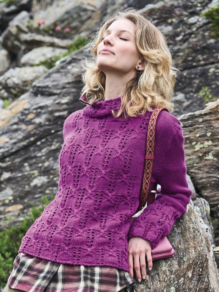Wenn es Kaschmir sein soll, greifen die Frauen gerne zu leuchtenden Tönen. Wie hier zu einem intensiven Zyklam, das die nach innen versetzten Zopf-Lochstrukturen auf glatt-rechts-gestricktem Fond perfekt zur Geltung bringt. Keine Angst: Wir haben die Einteilung der Muster genau in unserer Anleitung beschrieben, sowohl verbal als auch in Form von Strickschriften. Da es für diesen Pulli keine Blenden gibt, musst du nur noch den Stehkragen anstricken und ihn zur Hälfte nach innen säumen.