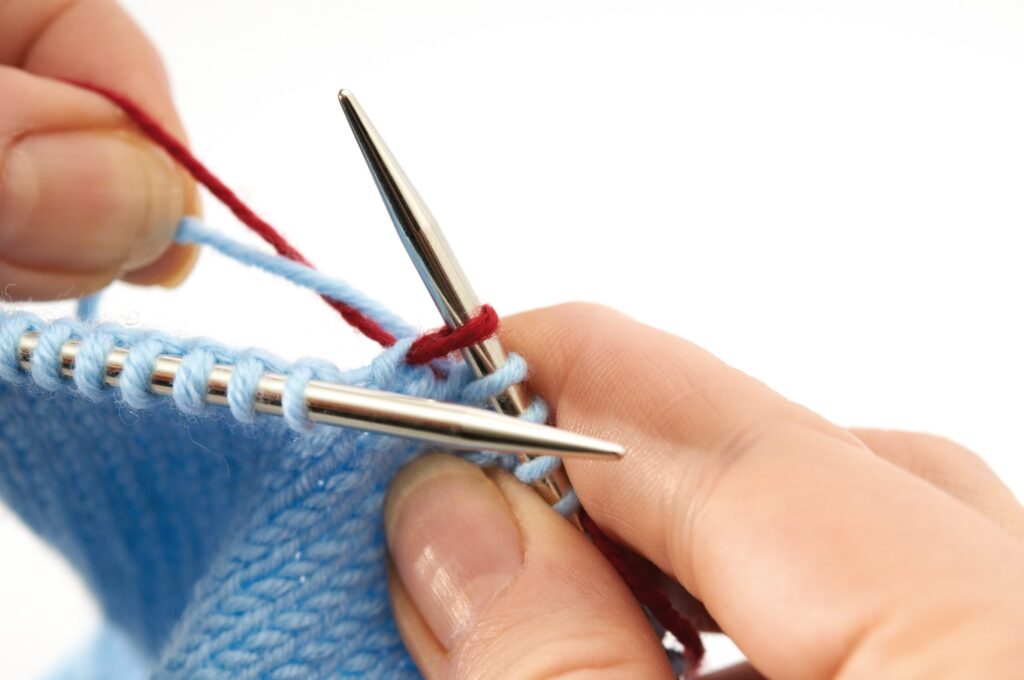 Du kannst die Fäden auch gleich beim Stricken einweben. Diese Methode ist besonders praktisch beim Intarsienstricken, um das Vernähen der unzähligen Fäden später zu vermeiden.