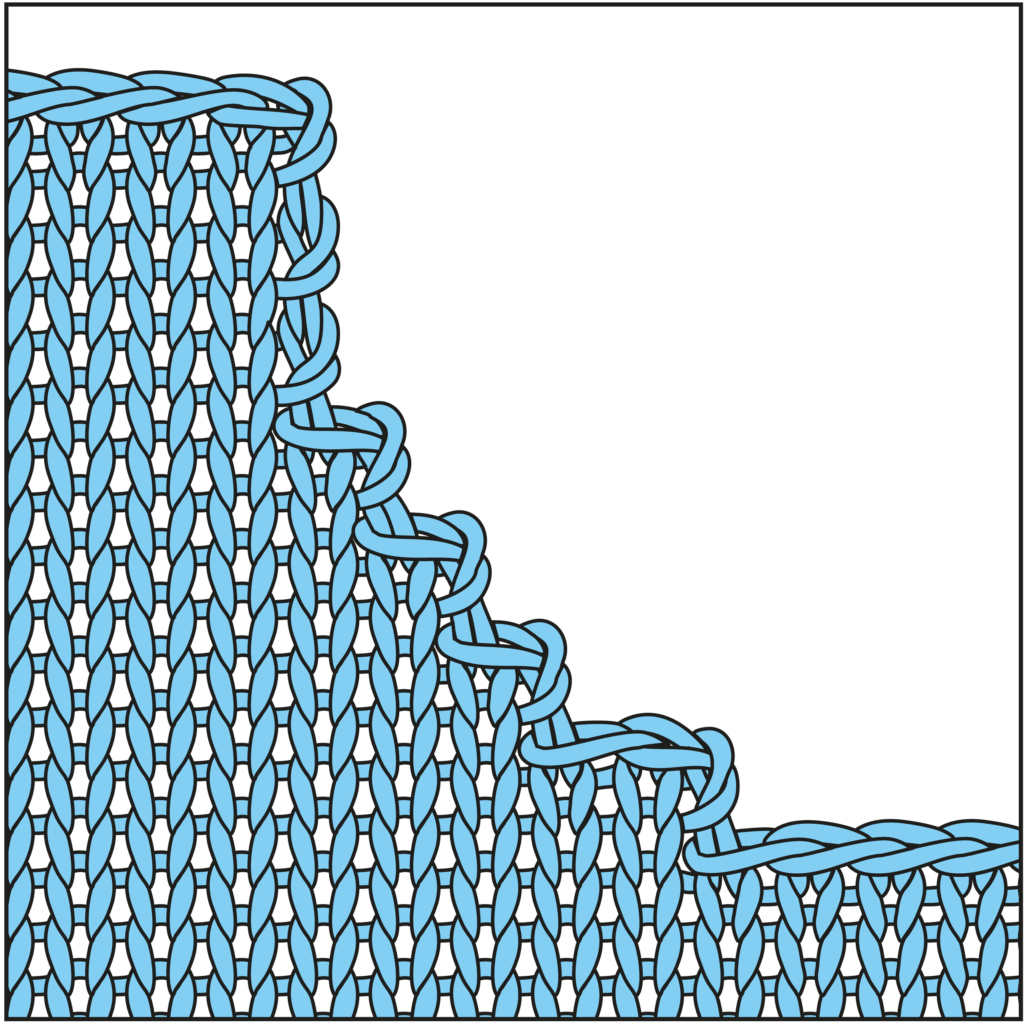 2. Beim Auffassen aus den Rundungen müssen die „Treppchen“, die beim Abketten entstanden sind, ausgeglichen werden. Dabei darf auch einmal die Masche einer Reihe tiefer erfasst werden, um eine gleichmäßige Rundung zu erreichen.