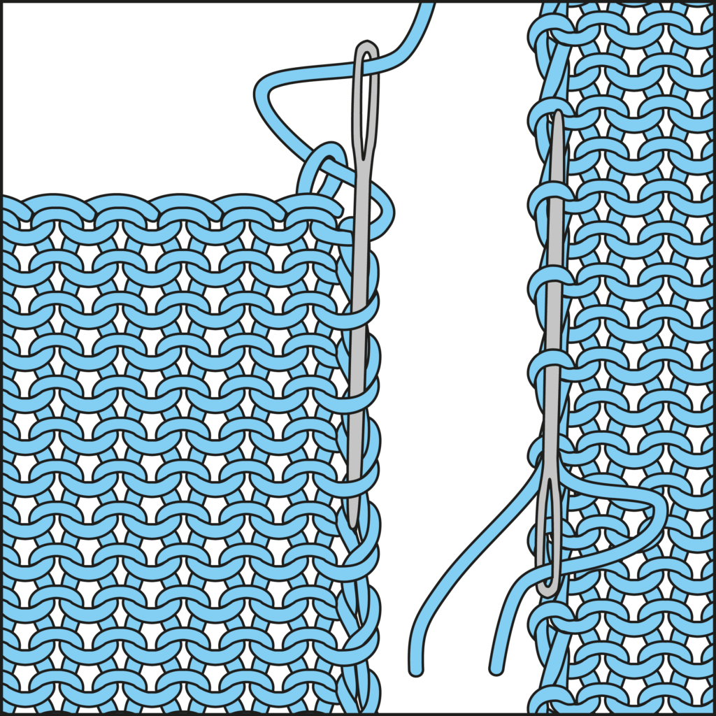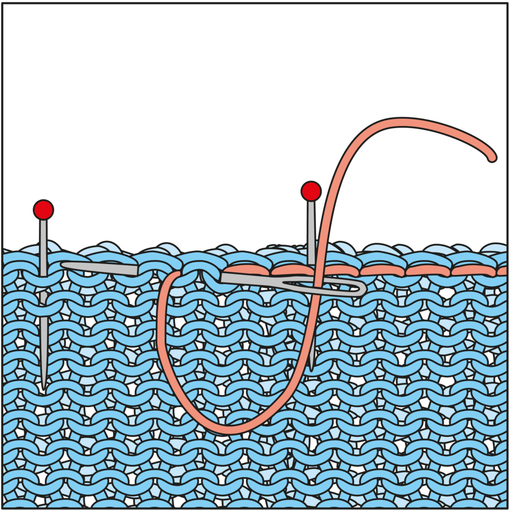 1. Die Abkettränder flach gegeneinander legen, die Vorderseiten liegen oben. An einer Kante beginnen, durch die halbe Randmasche des unteren Teils stechen und den Faden durchziehen. Nun in die Randmasche des oberen Teils einstechen und in der Mitte der nächsten Masche (unterhalb des Abkettrands) wieder ausstechen. Wie mit Pfeilen in der Abbildung gezeigt, auch beim unteren Teil mit der Nadel jeweils in eine Masche unterhalb der Abkett-Reihe einstechen und bei der nächsten wieder ausstechen.