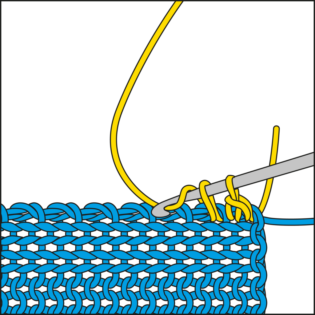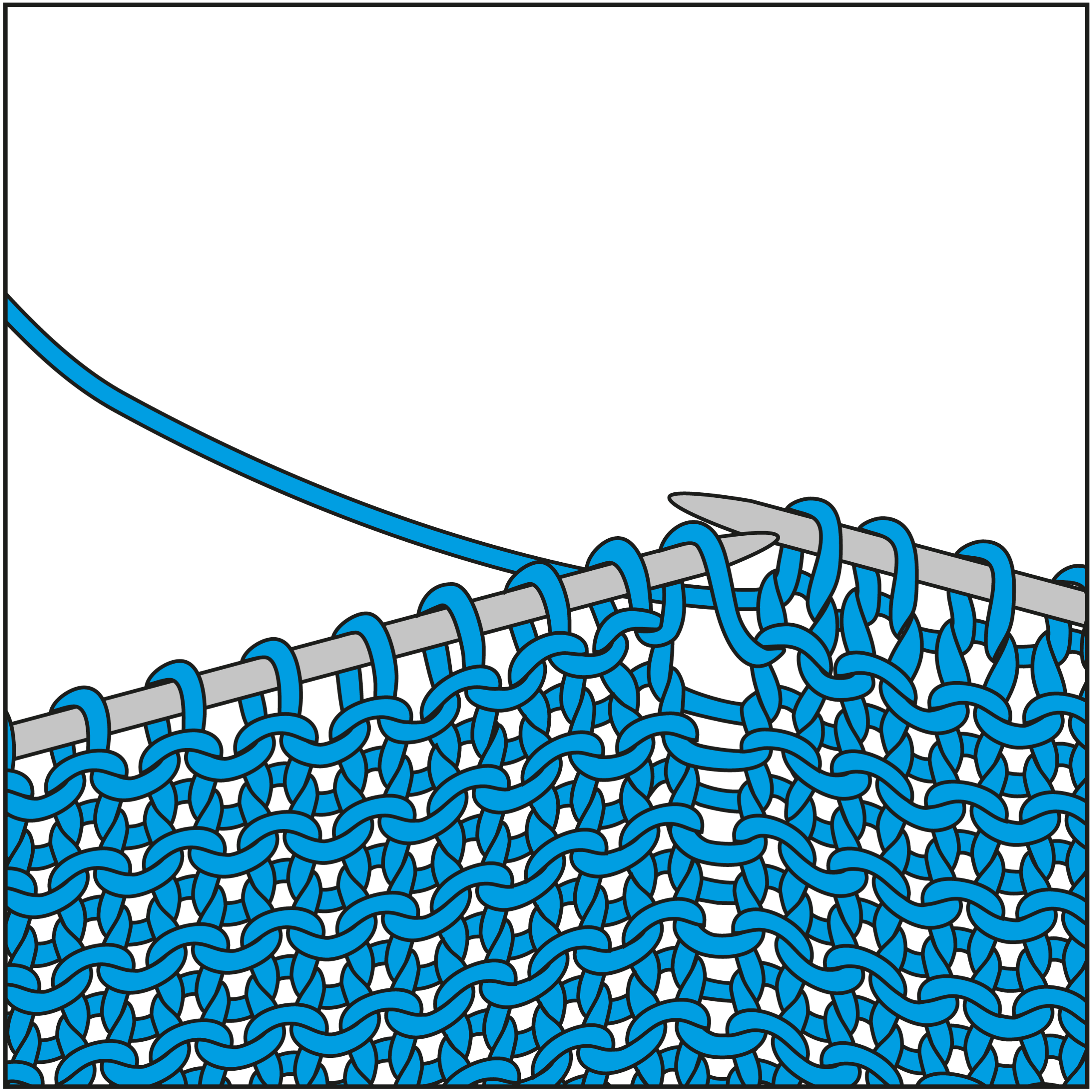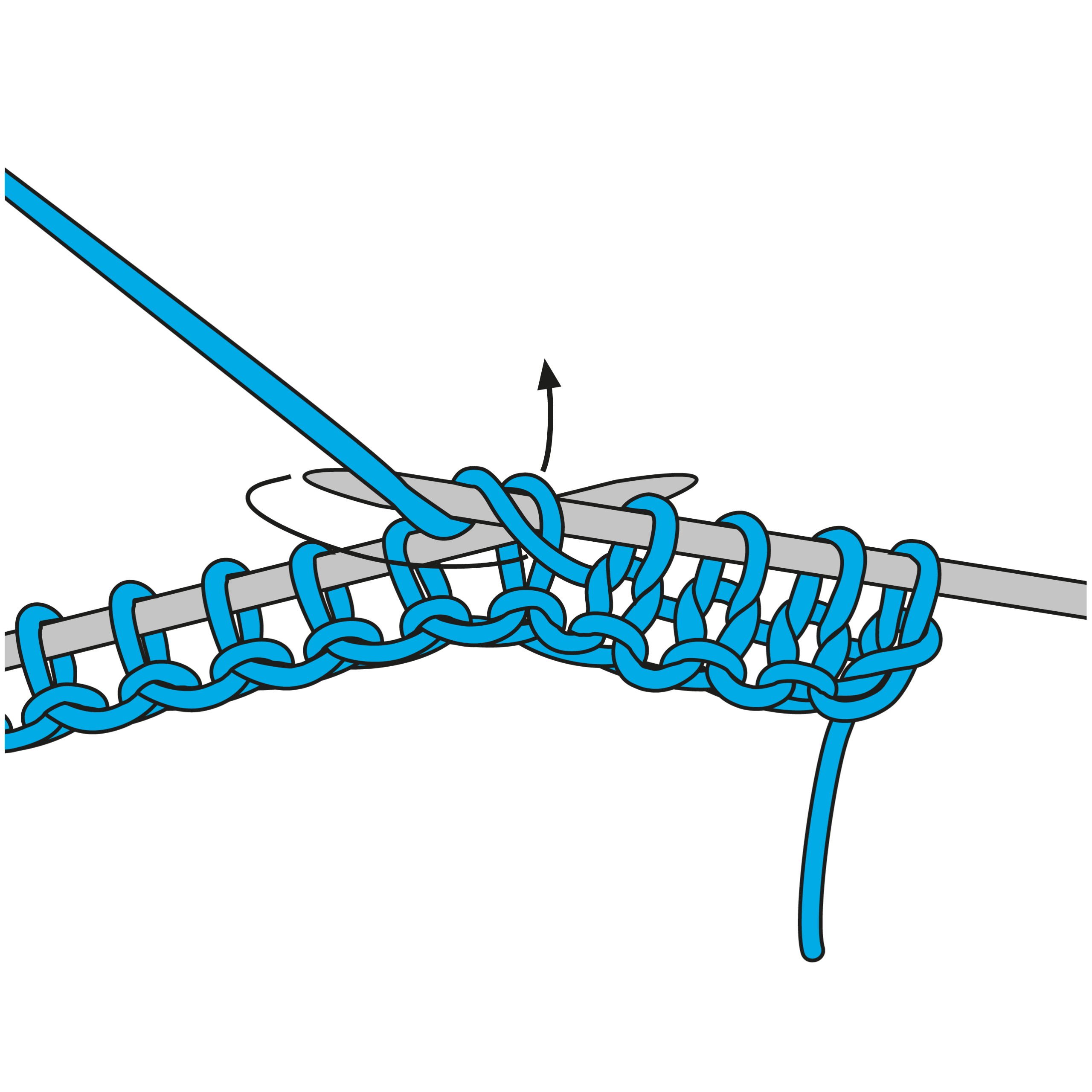 3. Beim waagerechten, geraden Abkettrand in die Masche unterhalb des Abkettrands einstechen und den Faden durchholen. Hier wird aus jeder Masche eine Masche herausgestrickt.