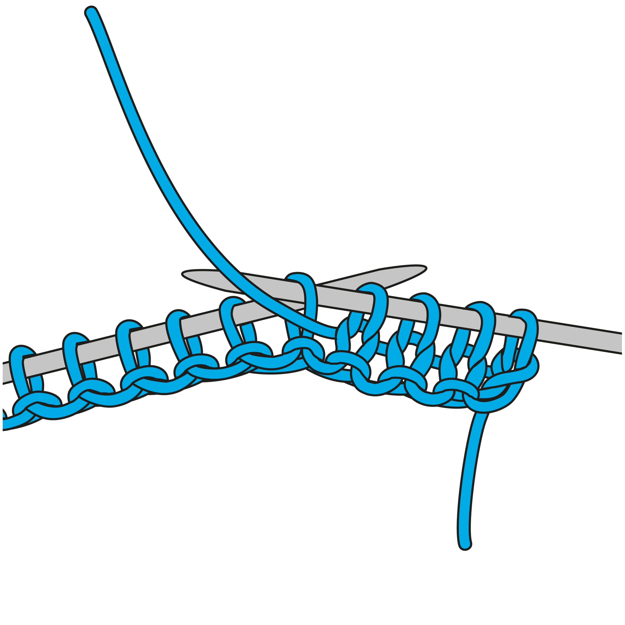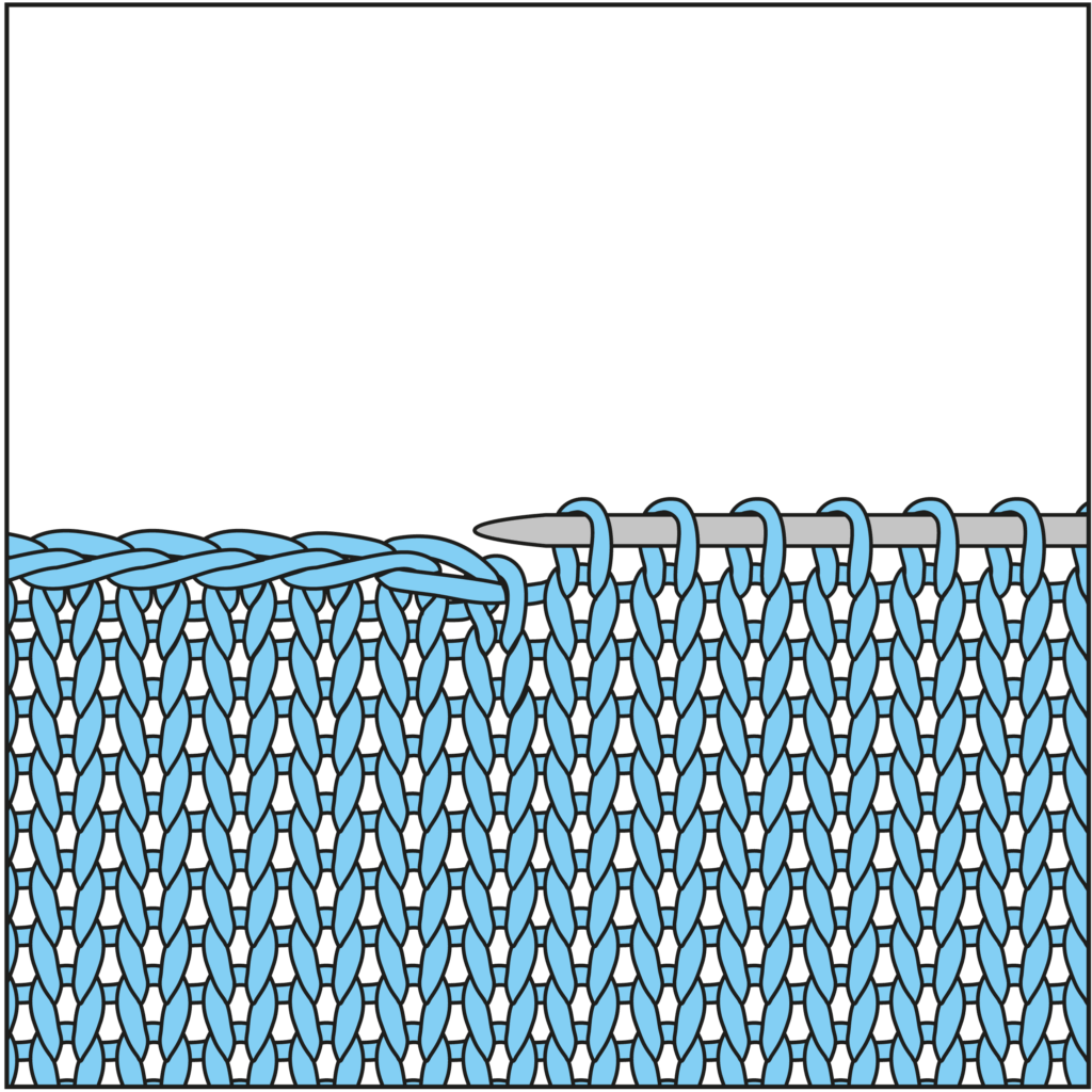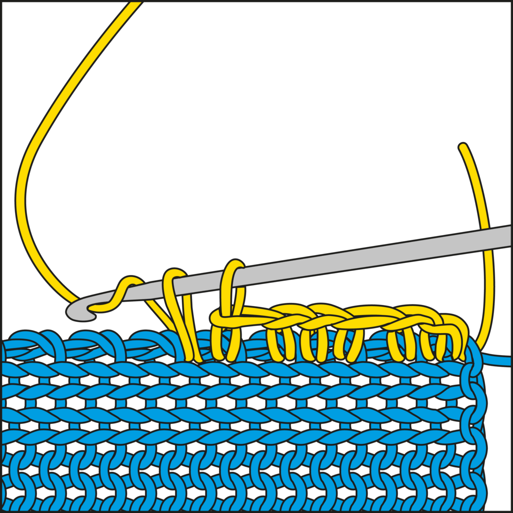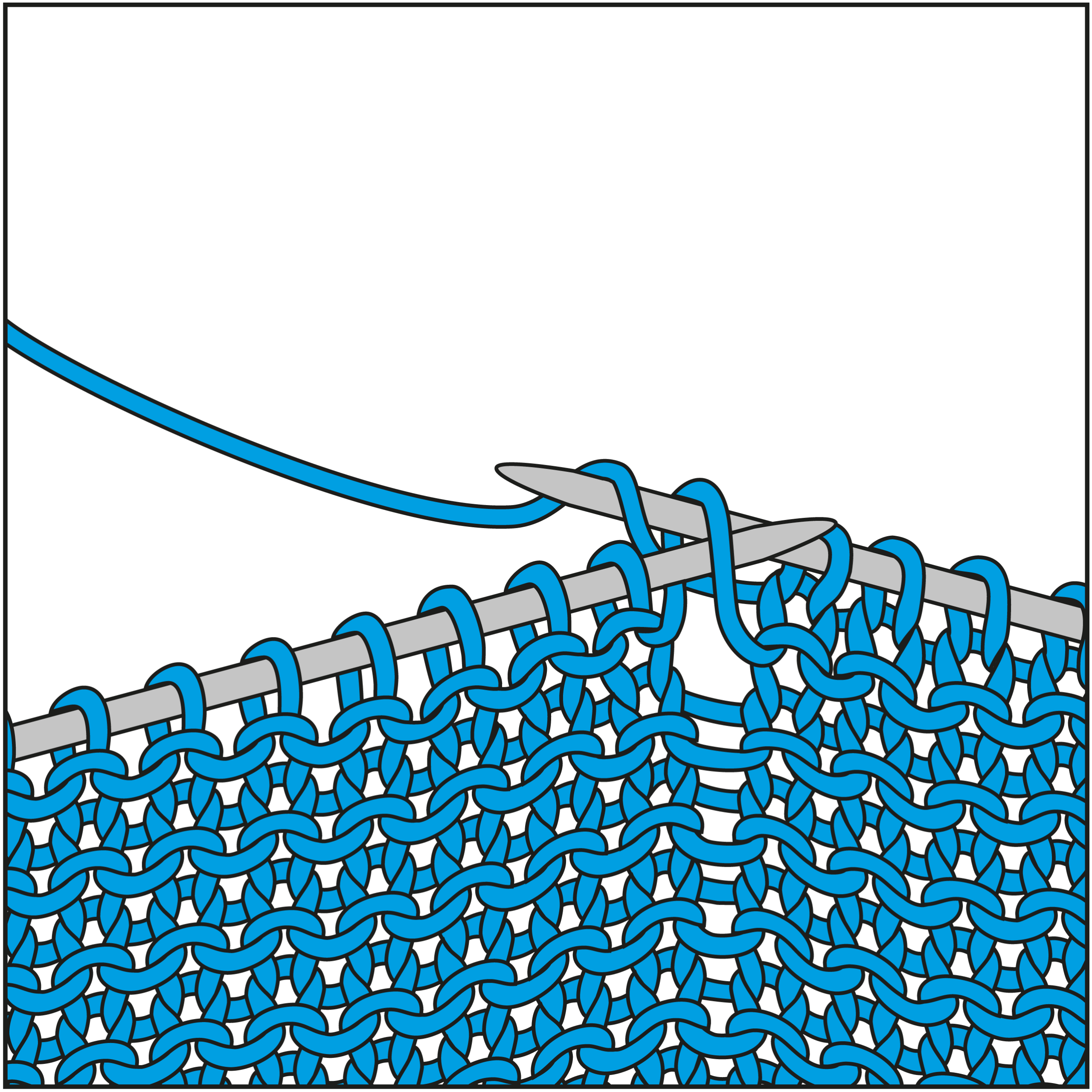 3. Beim waagerechten, geraden Abkettrand in die Masche unterhalb des Abkettrands einstechen und den Faden durchholen. Hier wird aus jeder Masche eine Masche herausgestrickt.