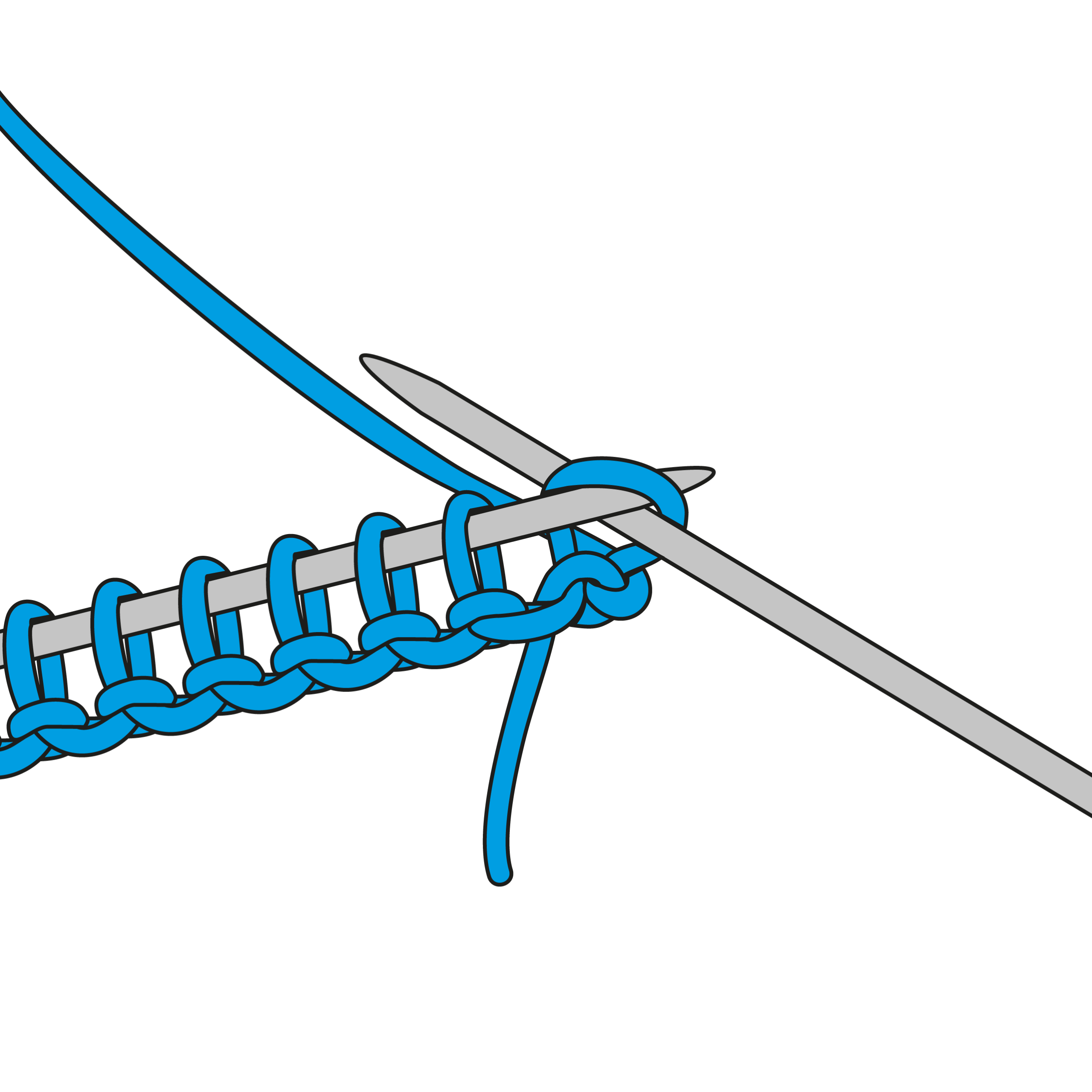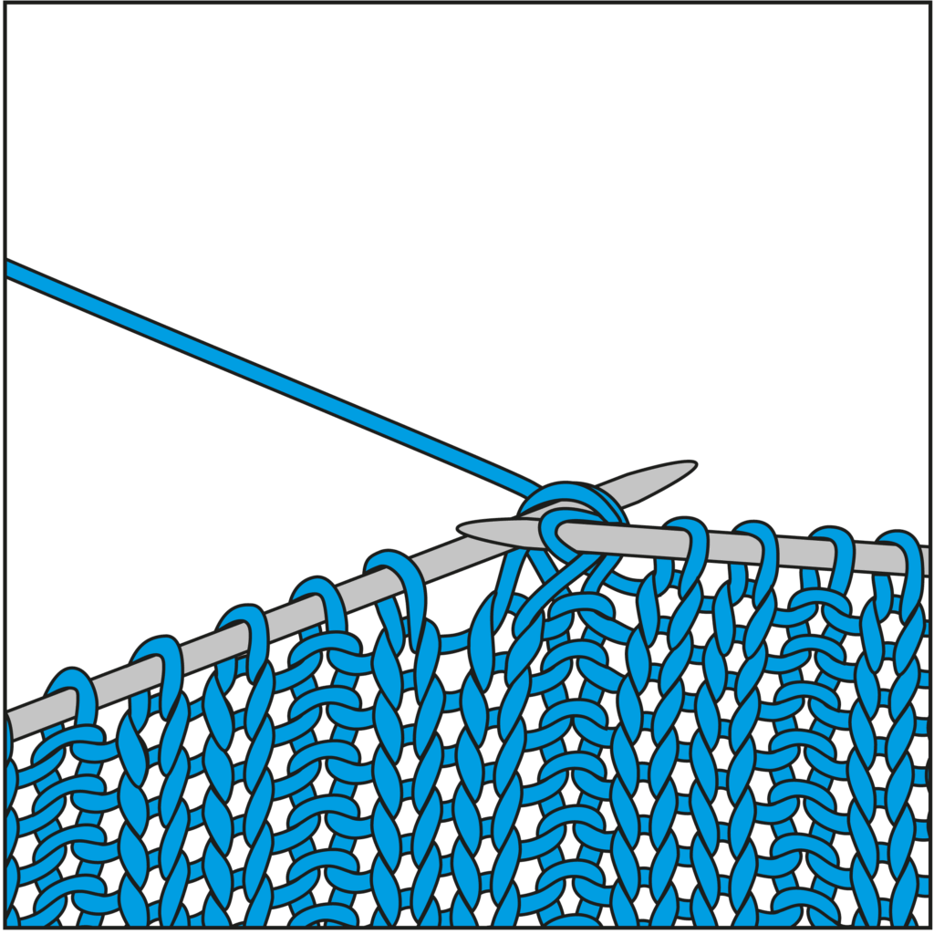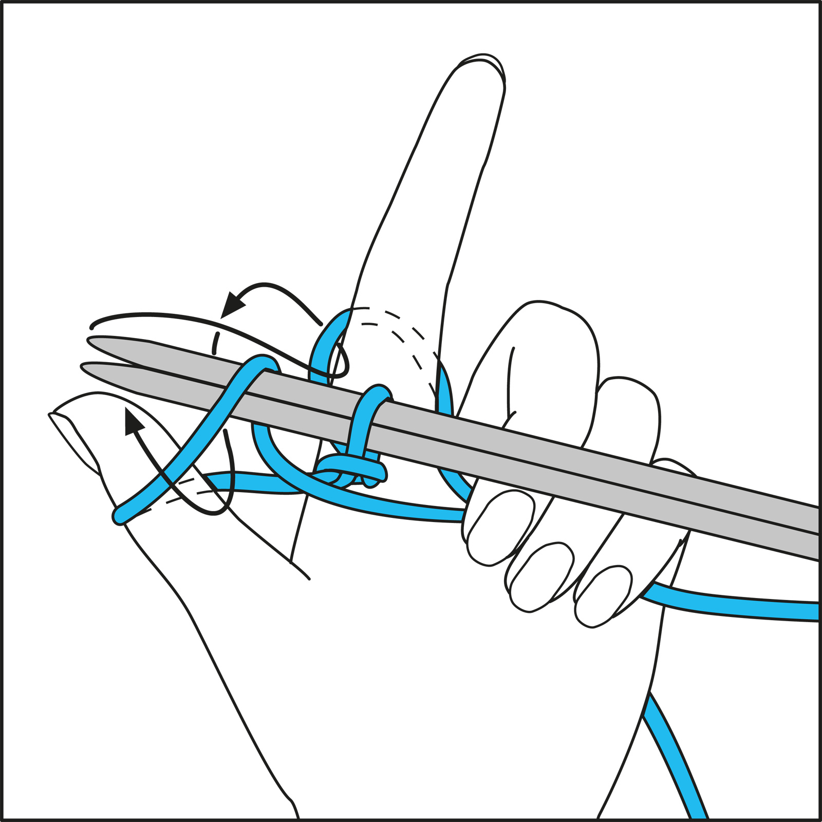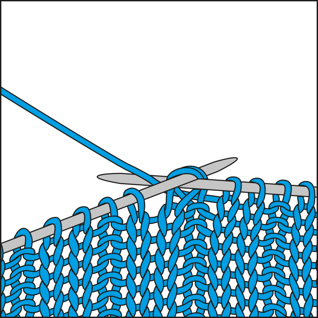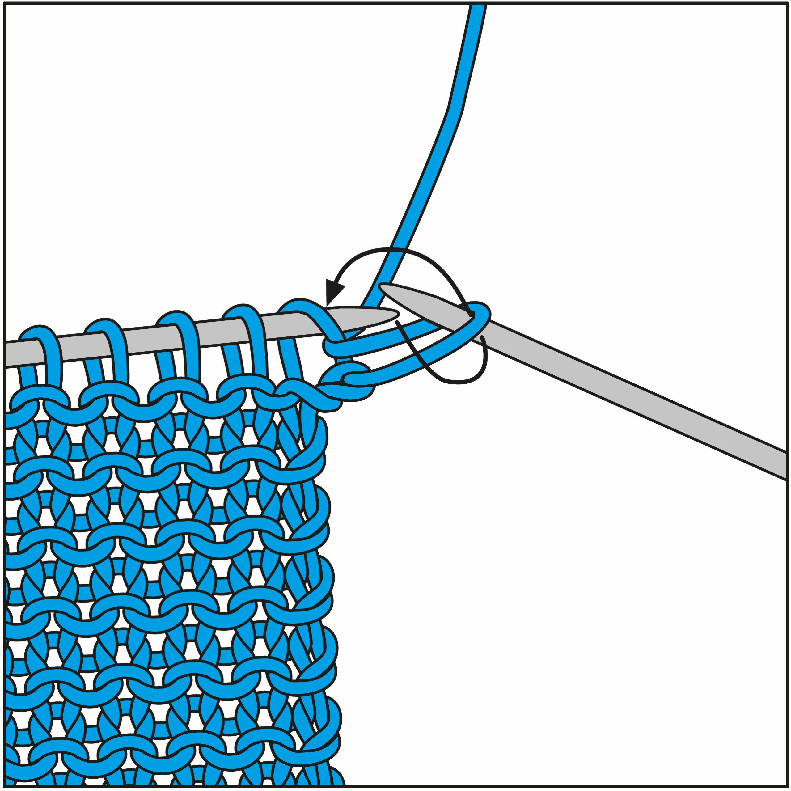 1. Dafür in die 1. Masche wie zum Rechtsstricken einstechen, den Faden zur Schlinge durchholen und auf der rechten Nadel lassen.