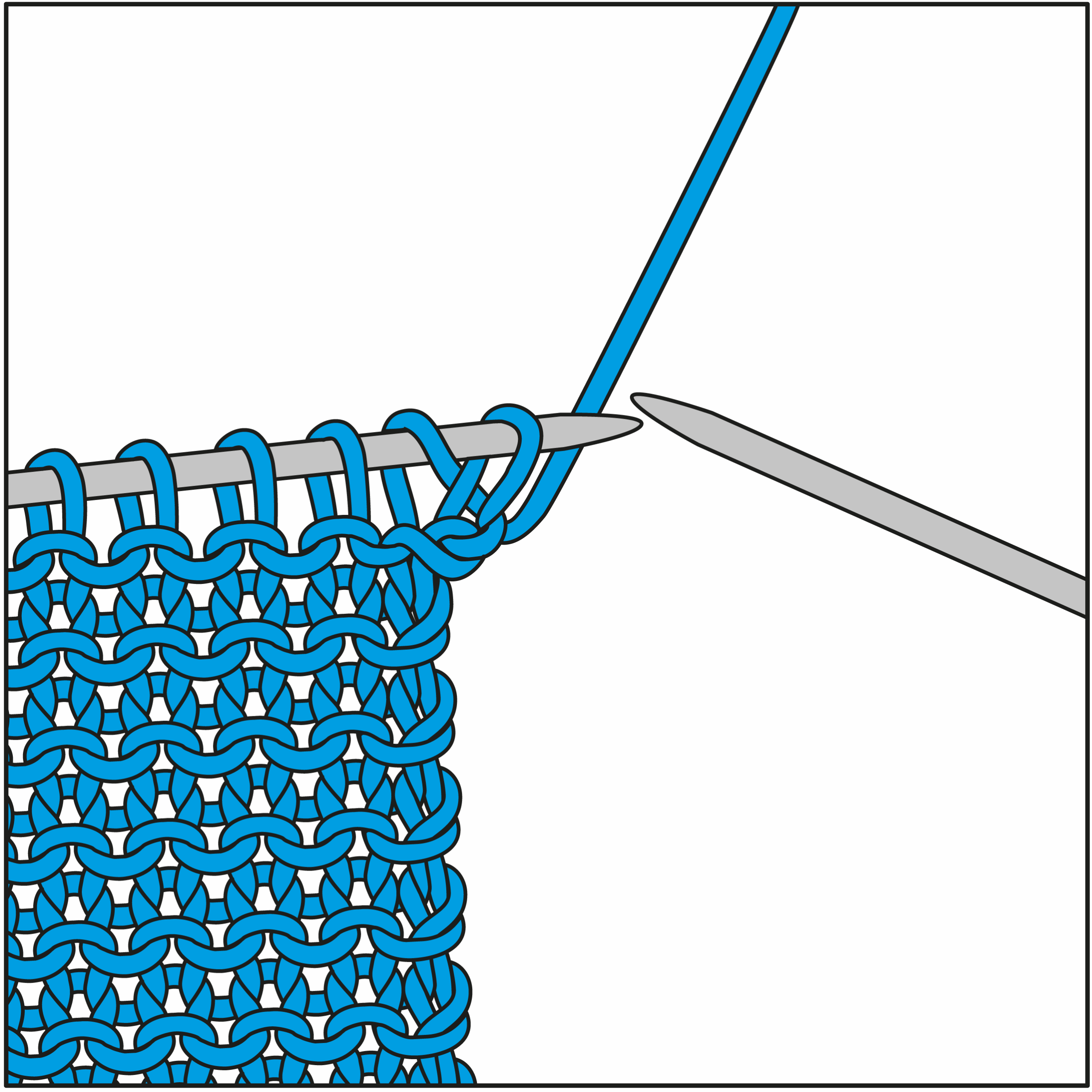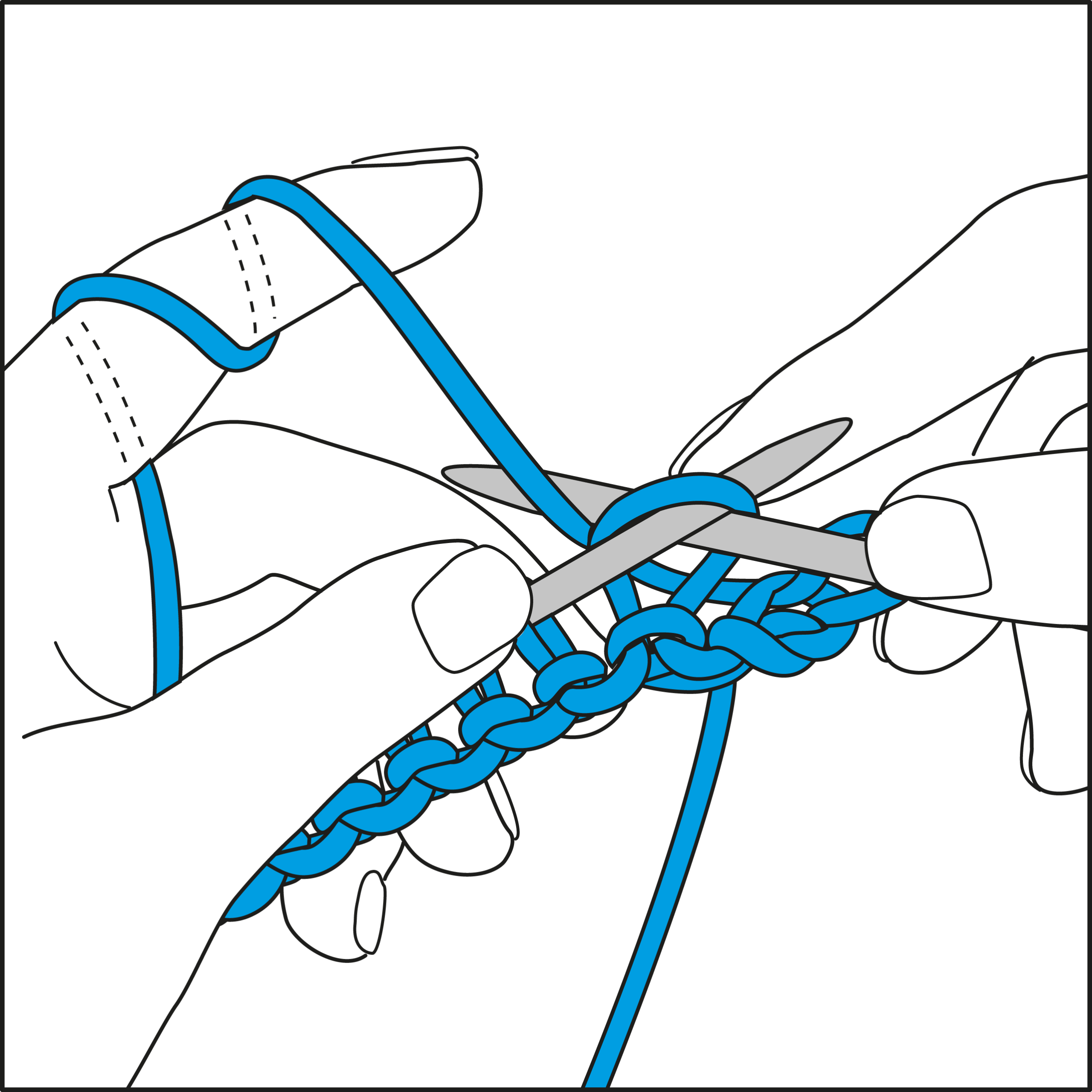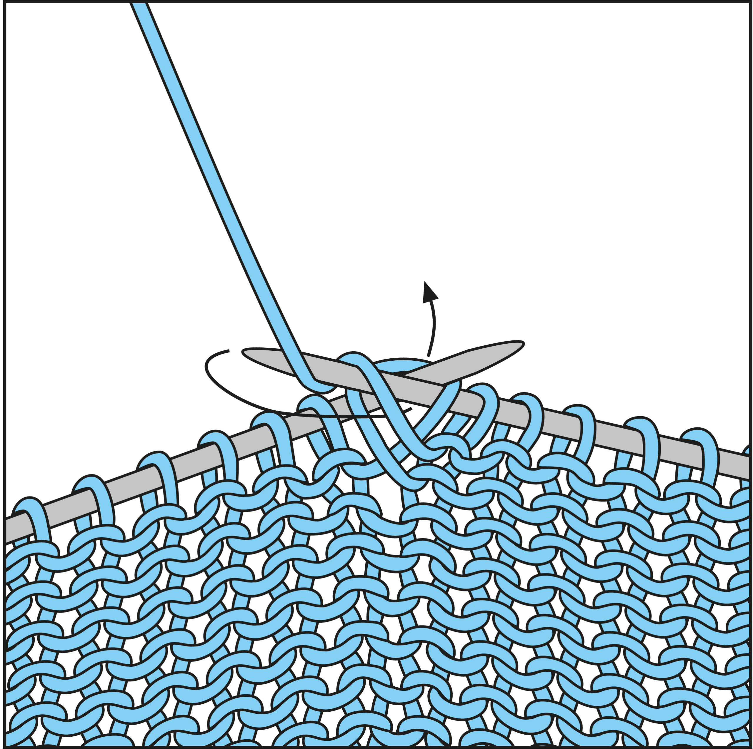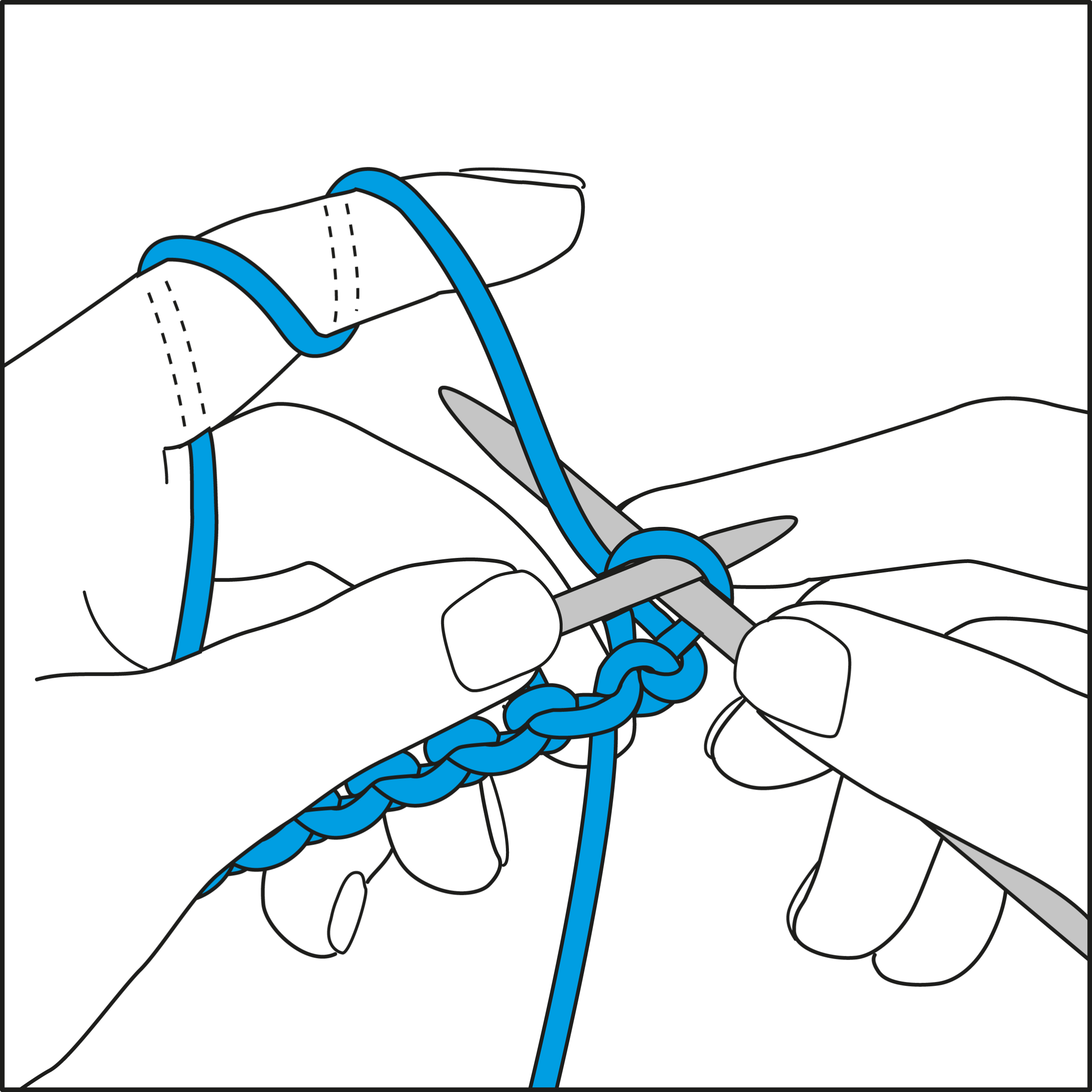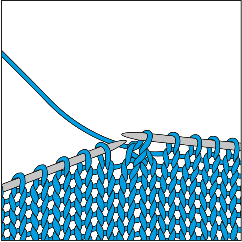 1. Dafür in die 1. Masche wie zum Rechtsstricken einstechen, den Faden zur Schlinge durchholen und auf der rechten Nadel lassen.