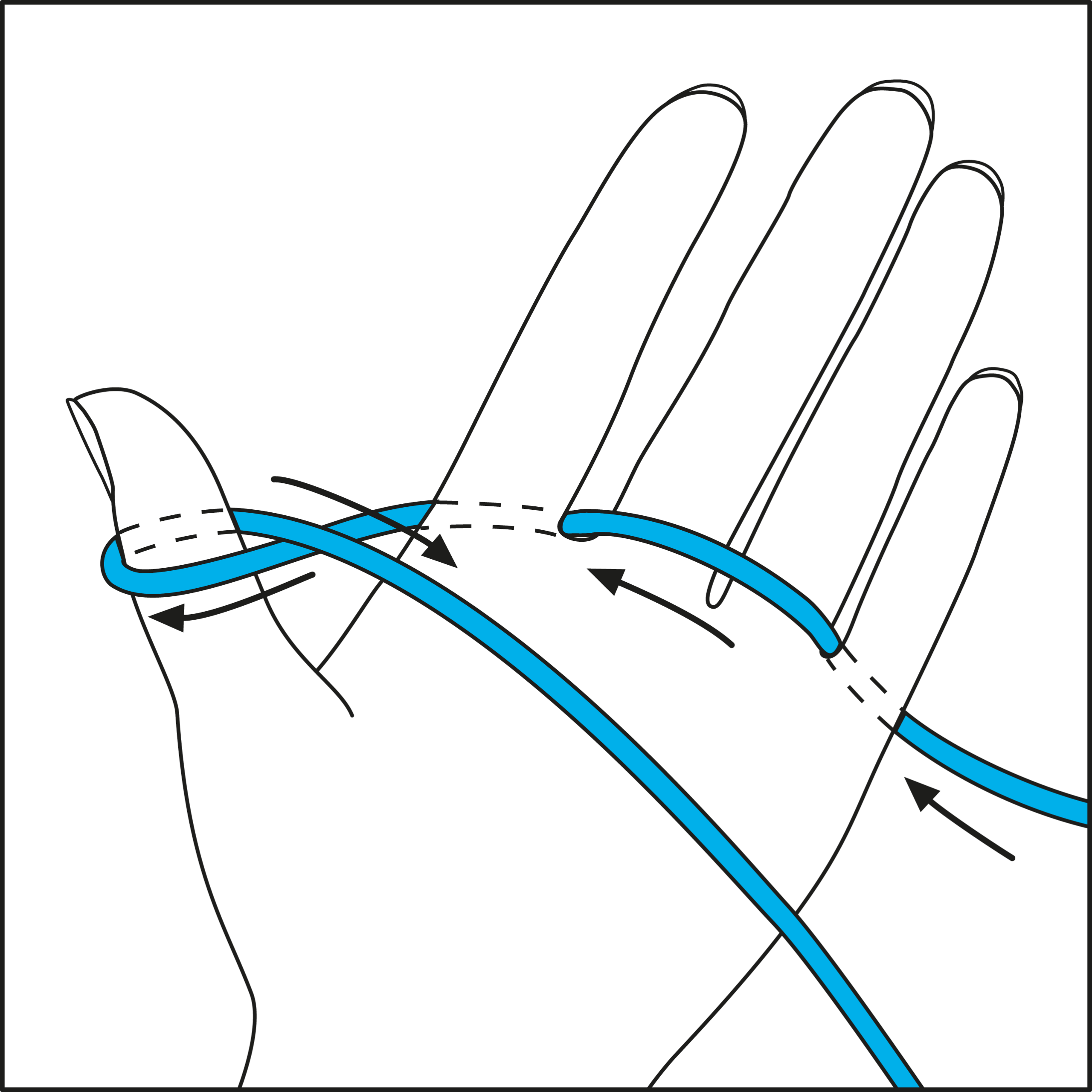 1. Fasse den Faden an der abgemessenen Stelle und lege diesen wie im Bild gezeigt um die linke Hand. Der Faden des Knäuels kommt vom kleinen Finger, das abgemessene Fadenende verläuft vom Daumen in die Hand.