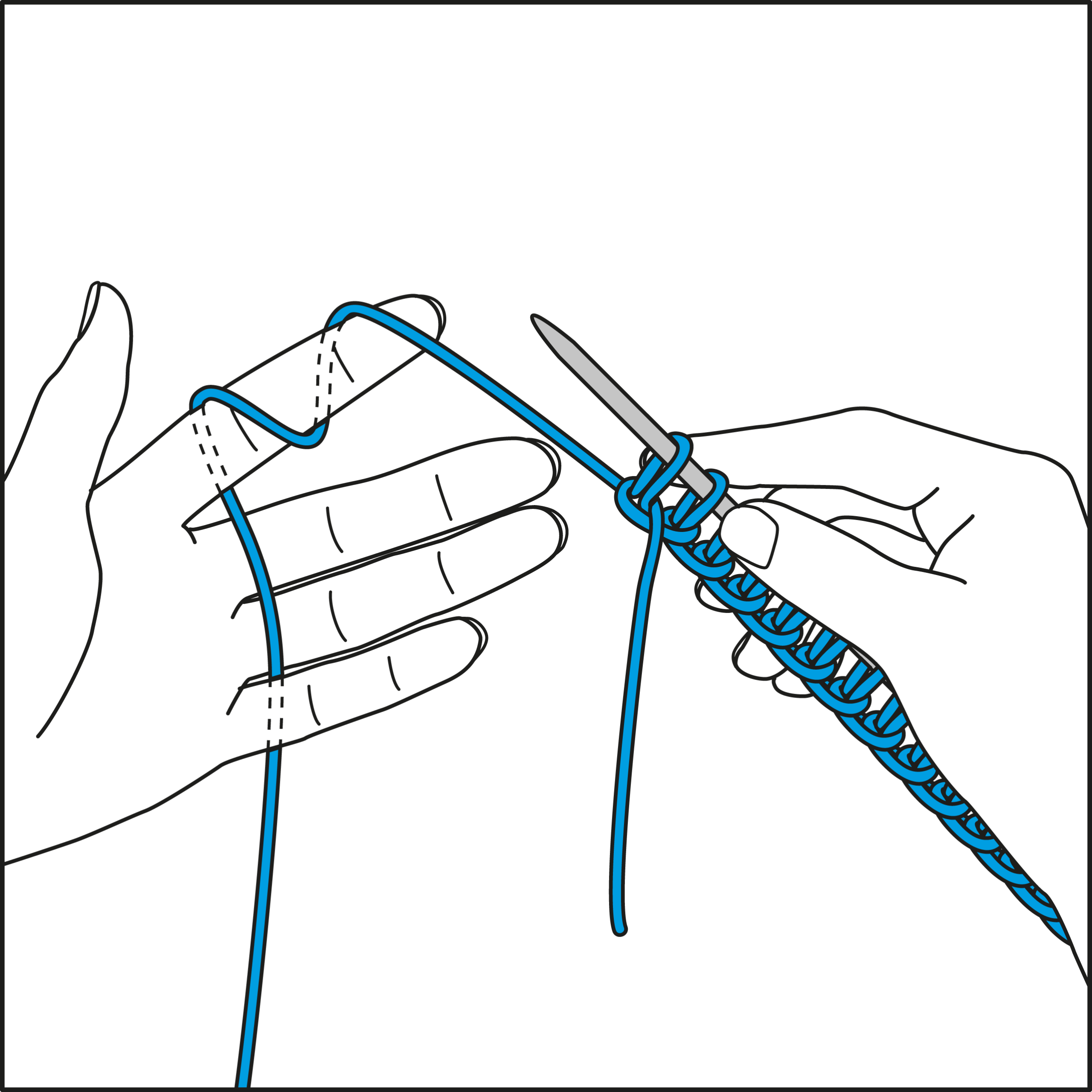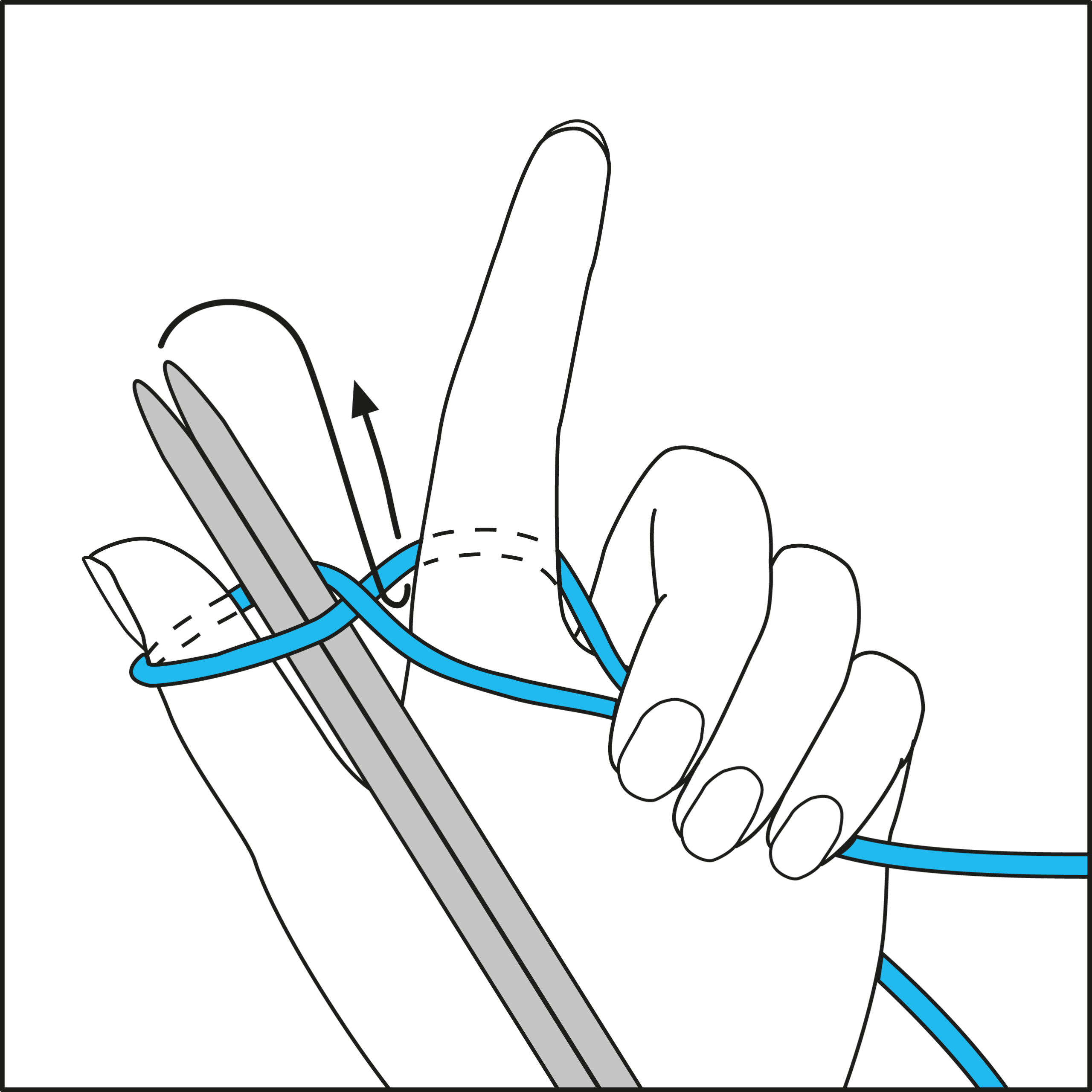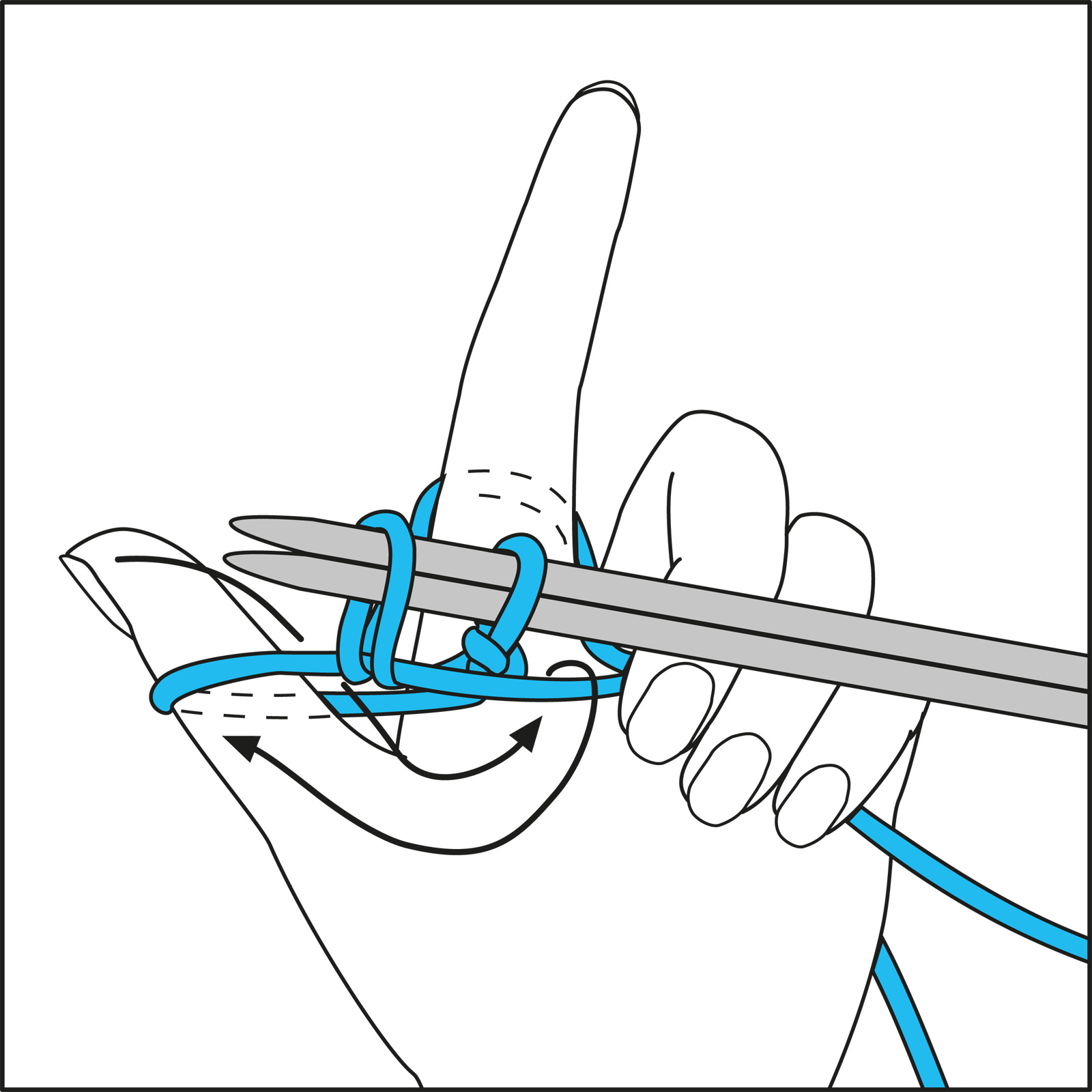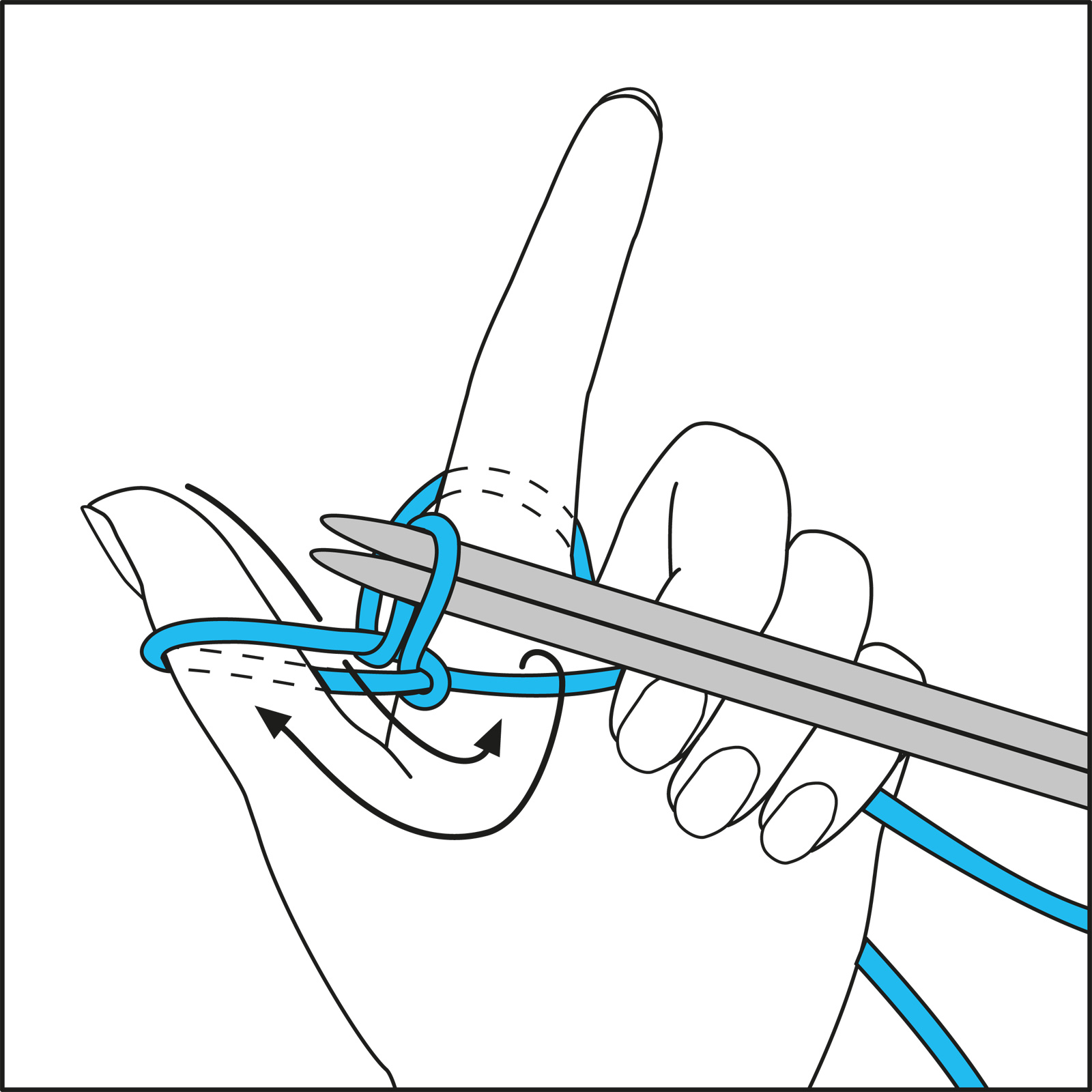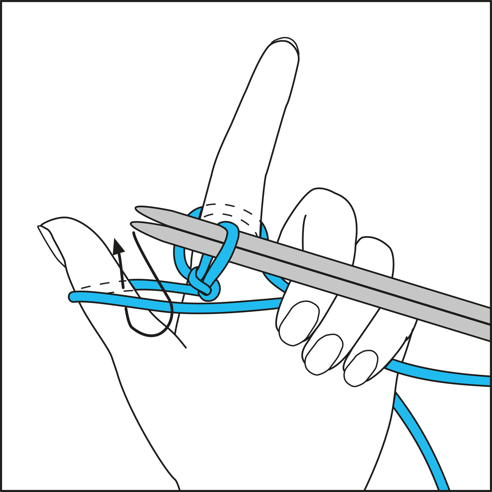1. Nehme die Nadel mit den angeschlagenen Maschen in die rechte Hand und wickele den vom Knäuel kommenden Faden, wie im Bild gezeigt, um deine linke Hand.