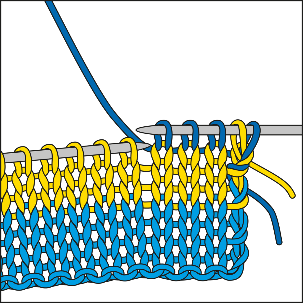1. Die letzte Randmasche vor dem Farbwechsel mit dem neuen und dem alten Faden zusammen, also zweifädig, rechts stricken.
