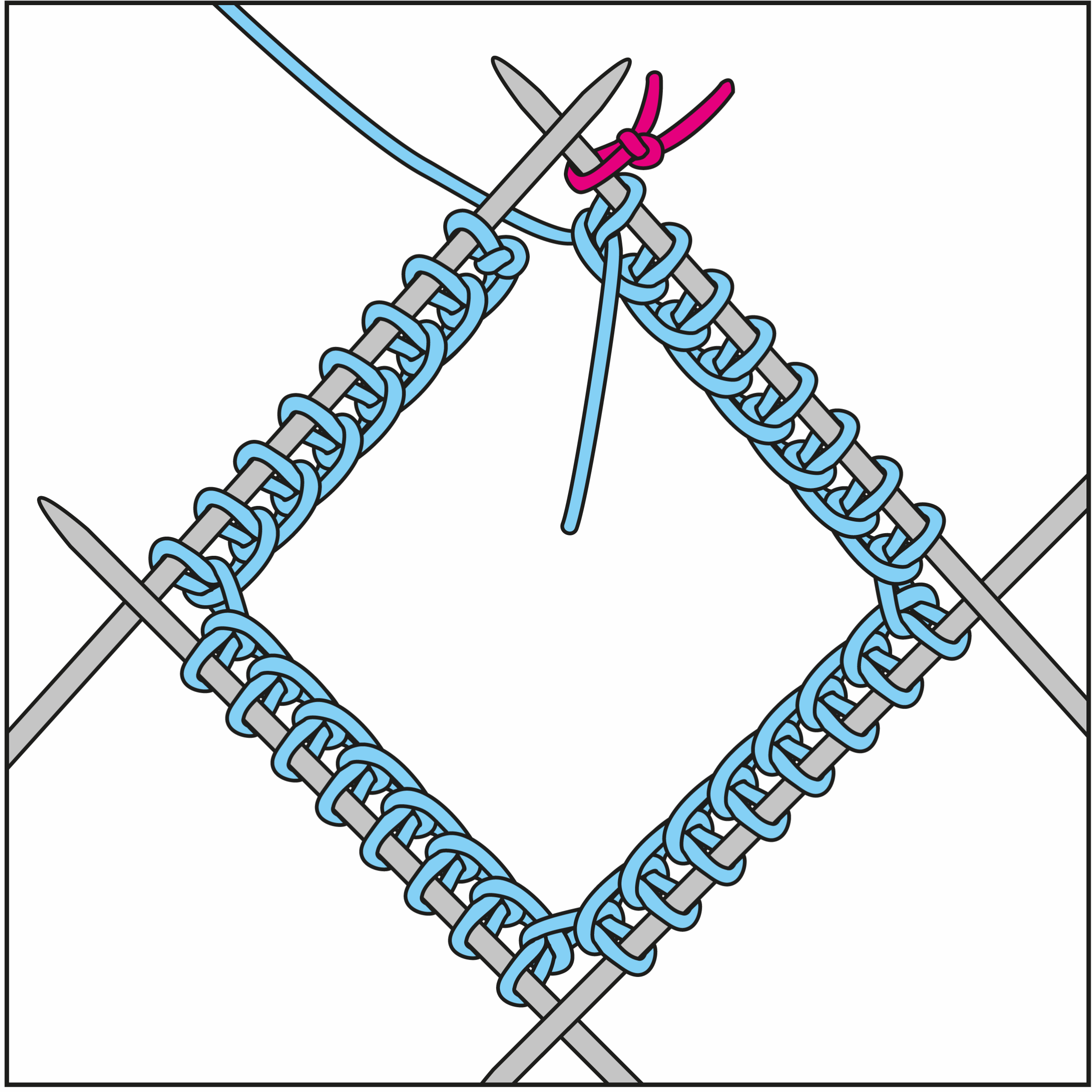 2. Die 4 Nadeln zu einem Quadrat legen, dabei darauf achten, dass die unteren Kanten aller Maschen nach innen weisen und keine Maschen verdreht sind. Das Fadenende markiert den Rundenanfang, evtl. zusätzlich den Rundenanfang nach der letzten angeschlagenen Masche mit einem andersfarbigen Faden markieren. Diese Markierung wandert beim Stricken mit nach oben und zeigt an, nach welcher Masche eine Runde abgeschlossen ist.