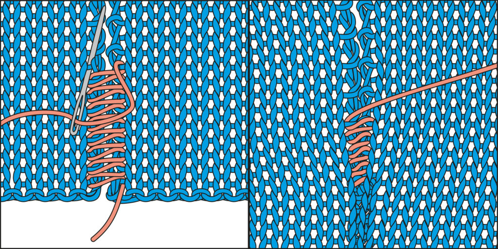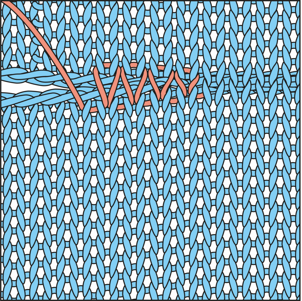 2. Geht ein Knäuel mitten in der Reihe zu Ende oder ist ein Farbwechsel in einer Reihe notwendig, werden die Fäden auf der Rückseite der Arbeit vernäht. Dabei zunächst durch die daneben liegende Masche stechen, sodass zwischen der letzten Masche des alten Fadens, und der ersten, die mit dem neuen Faden gestrickt wurde, eine Verkreuzung entsteht. Den Faden schräg in die Maschenreihen einziehen, dabei immer nur einen Teil der Maschenglieder erfassen, damit der Faden auf der Vorderseite nicht sichtbar ist.