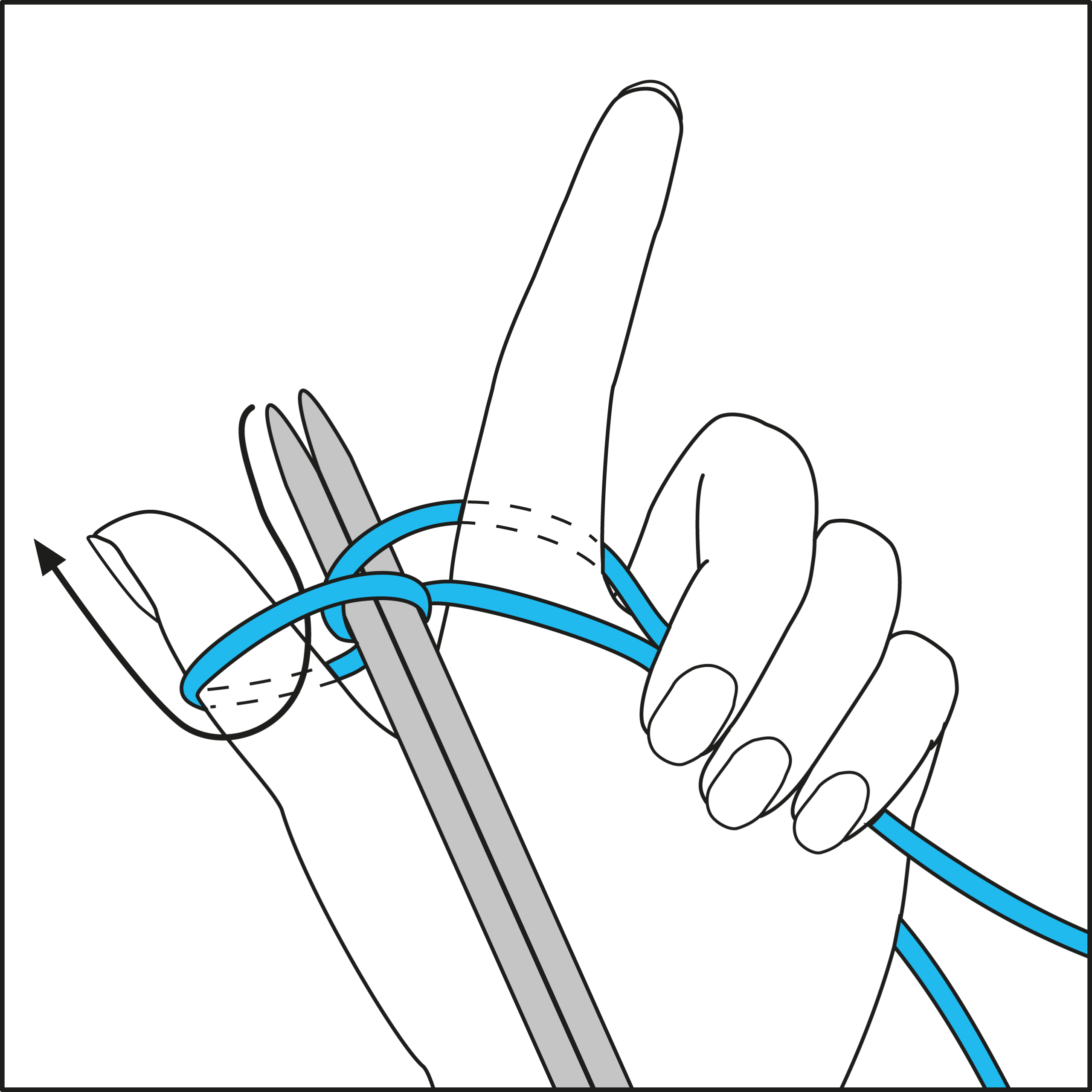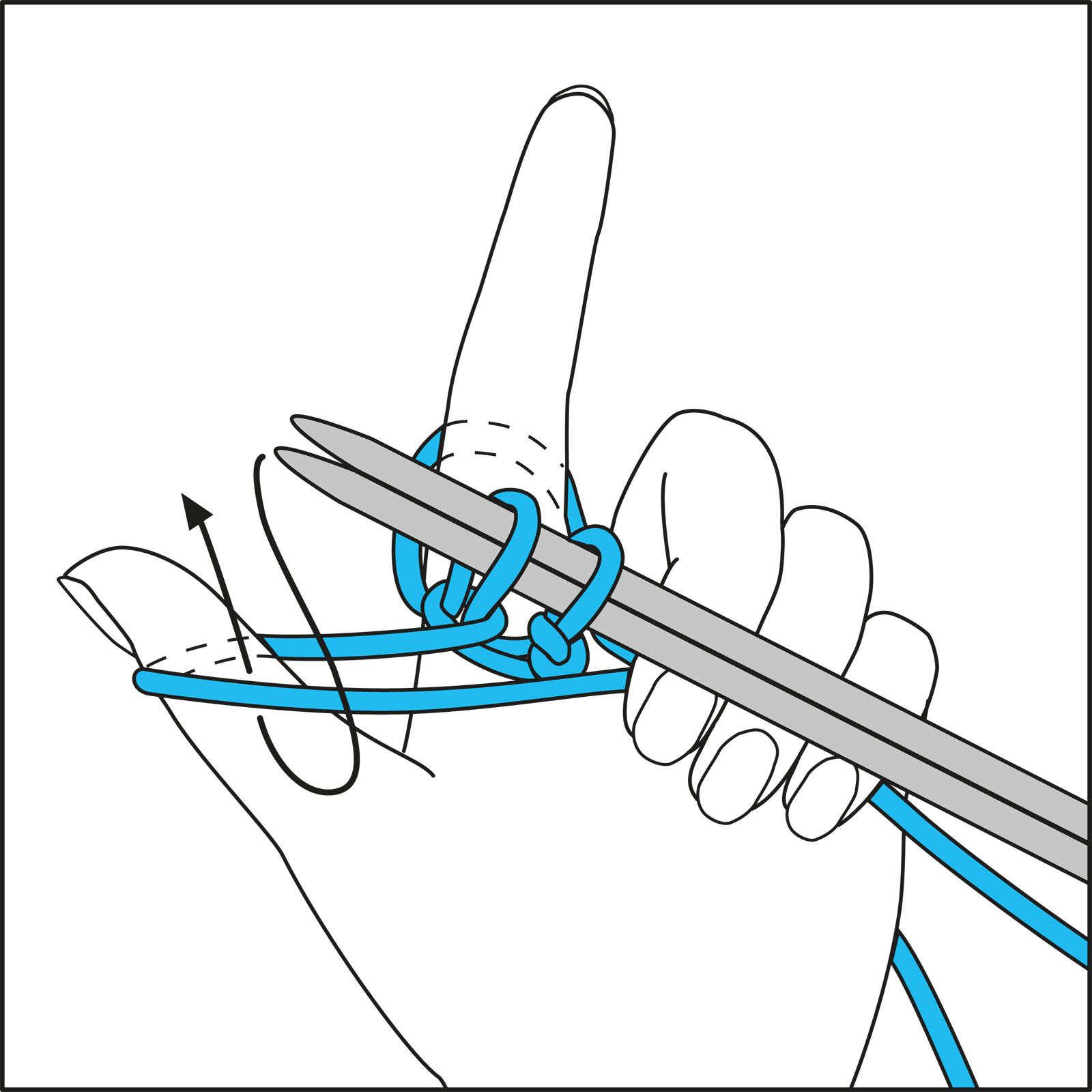 4. Jetzt den Daumen aus der Schlinge ziehen, unter den vorderen Faden schieben und den Faden, durch Strecken des Daumens in die Ausgangsposition, festziehen. Und schon liegt die erste Masche auf den Nadeln.