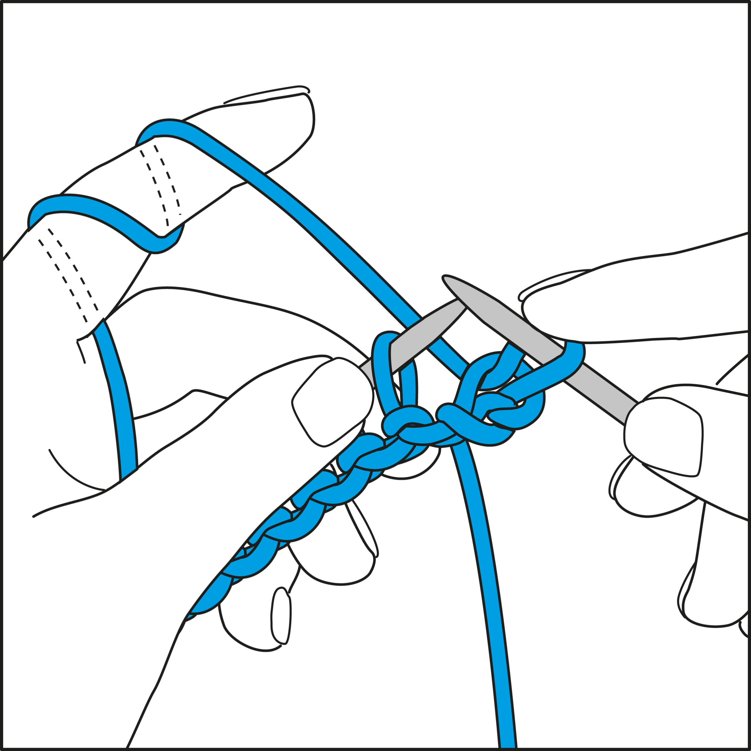 5. Achte darauf, dass du die Maschen auf der rechten Nadel stets mit deinem Daumen zurückhältst, während du die nächste Masche auf der linken Nadel mit dem Mittelfinger Richtung Nadelspitze schiebst. Steche mit der rechten Nadel von vorn in die nächste Masche der linken Nadel.