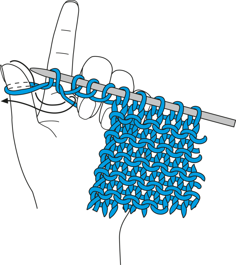 6. Arbeite die 2. und alle folgenden Reihen genauso. Dazu musst du nach jeder Reihe die Nadel mit den Maschen wenden. Auch hier ist es wichtig, dass die Fadenführung und Handhaltung stets beibehalten wird, wie es in Schritt 2 beschrieben steht.