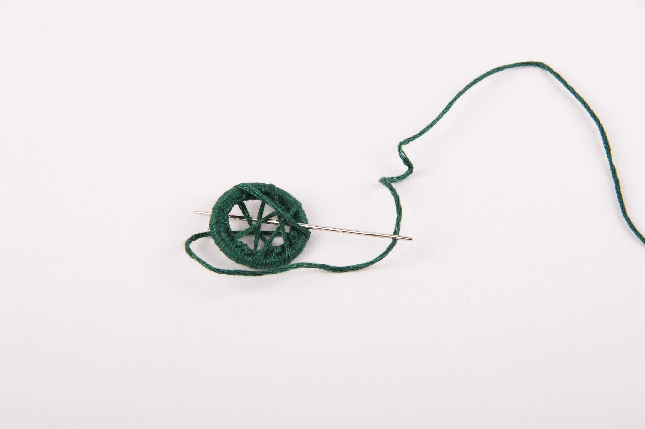 Auf der rechten Seite der Speiche das Garn zurück nach unten führen. Zwei Speichen weiter links wieder nach oben zurückstechen.
