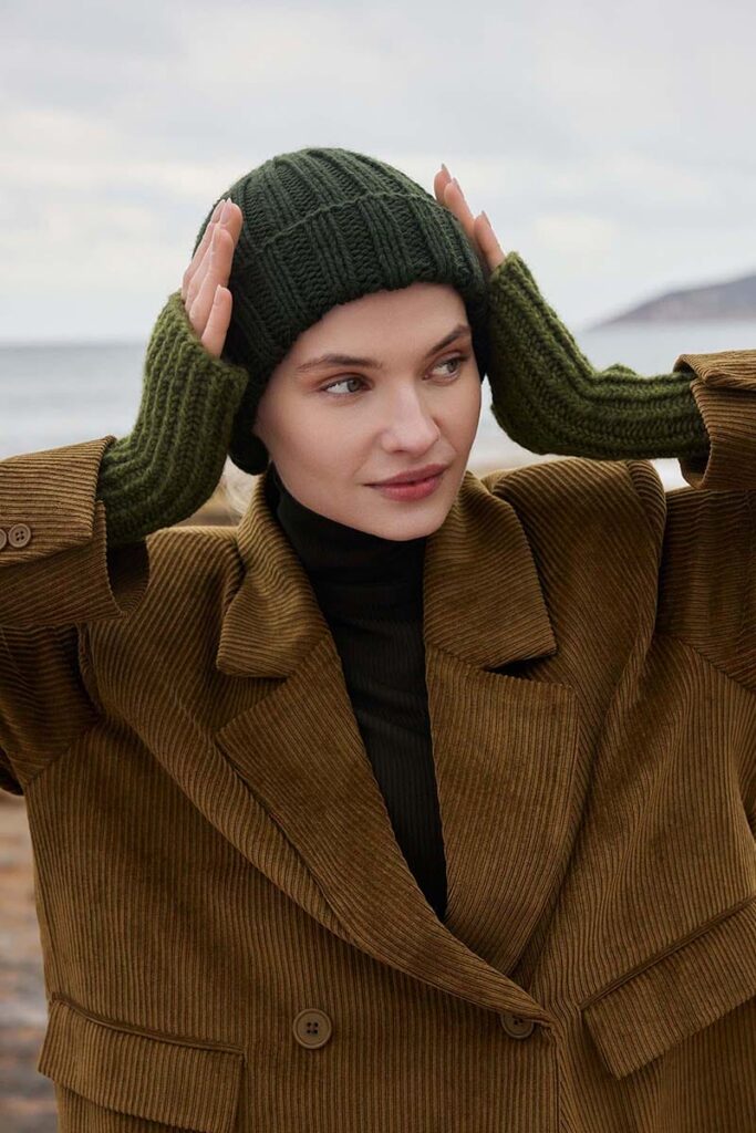 The DIVERGING TRAILS hat and CLEAR COURSE mittens embrace both clarity and exploration. The CLEAR COURSE hat reflects a steady path forward with its clean, structured design, while the DIVERGING TRAILS mittens play with shifting lines, symbolizing the twists and turns along the way. Worn together, they remind us that even the most defined journeys leave room for unexpected detours.