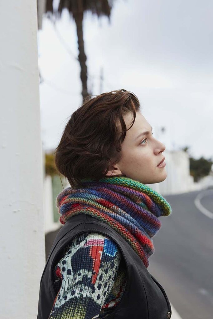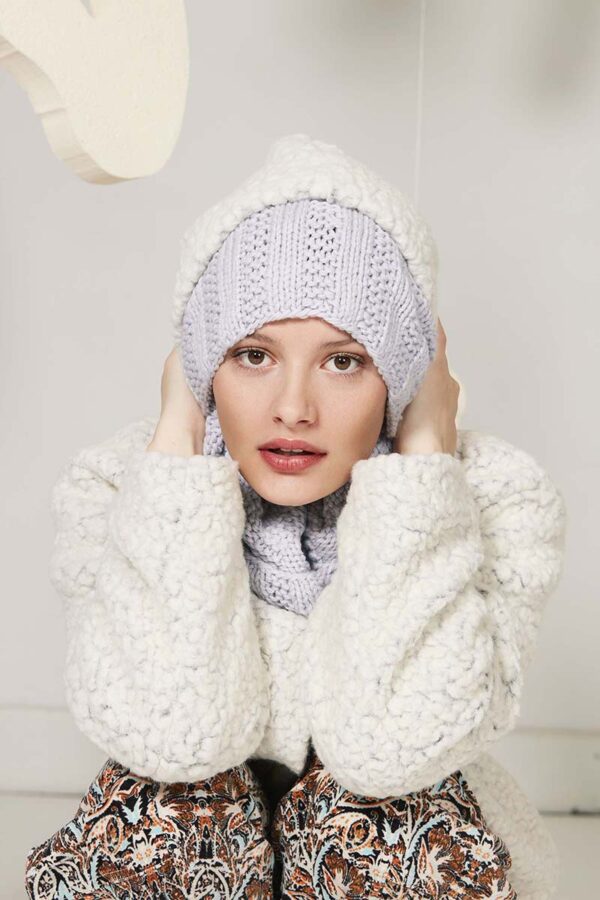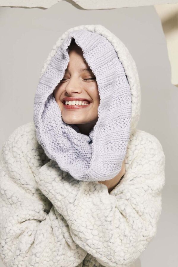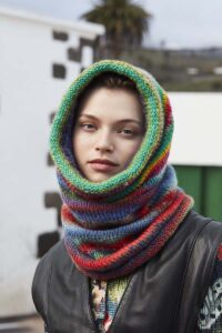 Whether worn as a hat, cowl, or hood, this knitted creation seamlessly adapts to the circumstances. Like the ever-shifting patterns in a kaleidoscope, it transforms with the flick of the hand.