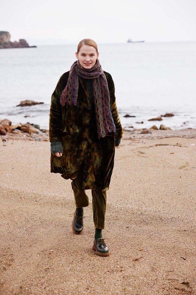 A symbol of continuity and connection, the FULL CIRCLE scarf features circular openings that flow seamlessly throughout its design. Knit width-wise, its unique construction uses strategically placed bind-offs and cast-ons to create these ‚cut-out‘ spaces, adding visual intrigue and a sense of movement. Just like lifes cycles, the yarn comes back around.